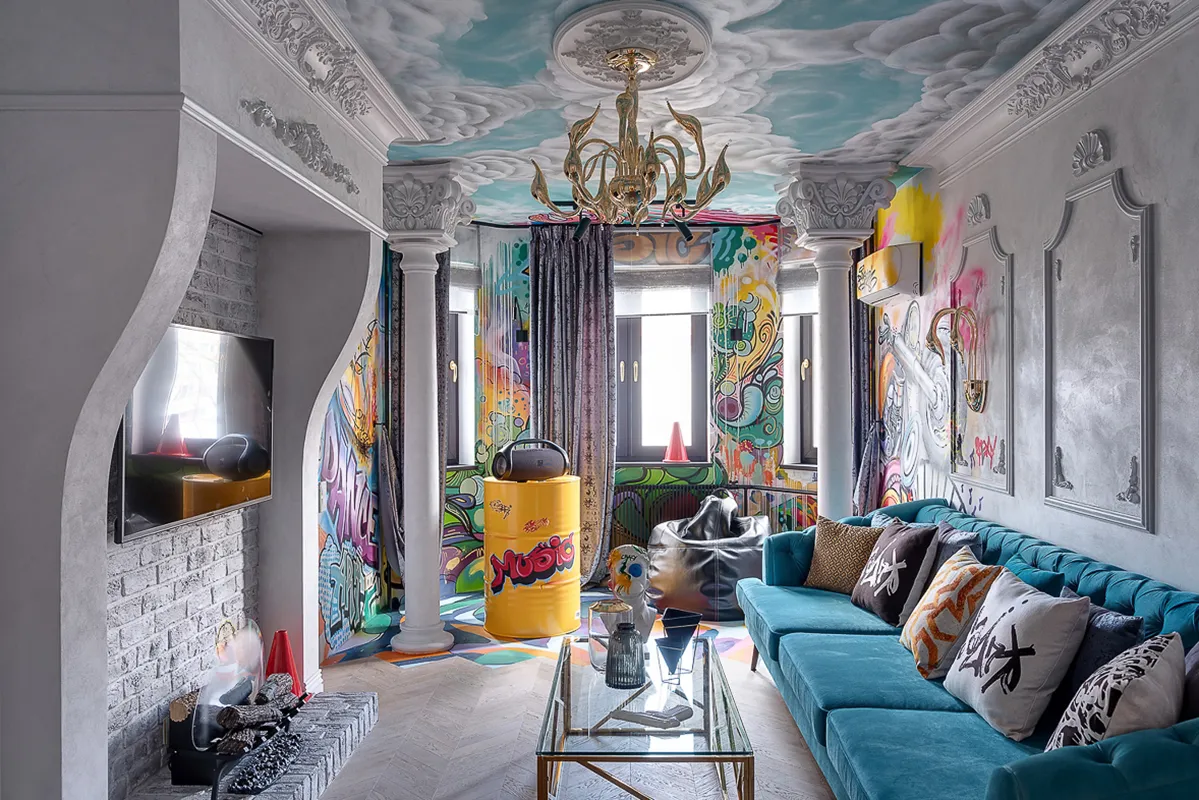Этот прием лег в основу всего интерьера, который получился ярким и дерзким. Дух бунтарства и свободы на фоне нарочитого барокко, стрит-арт и классика. Под стать хозяевам этой гостиной – молодой, эксцентричной и очень творческой паре.