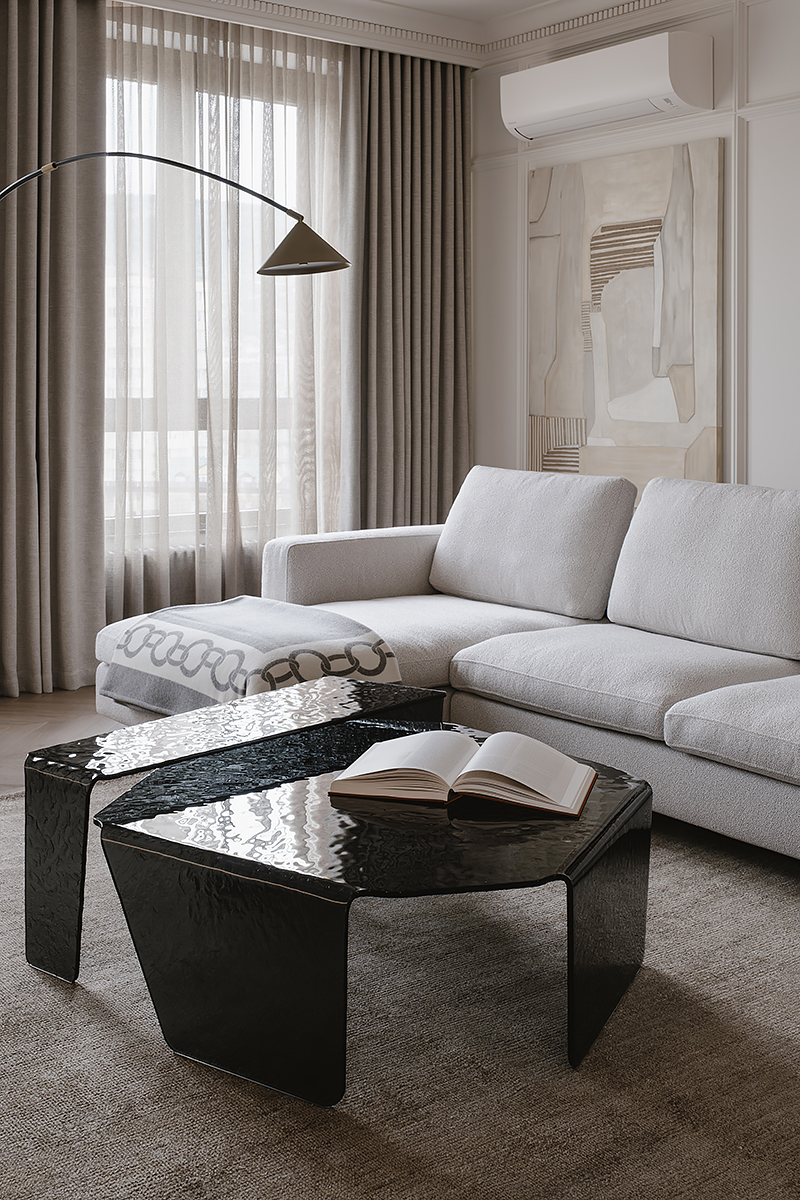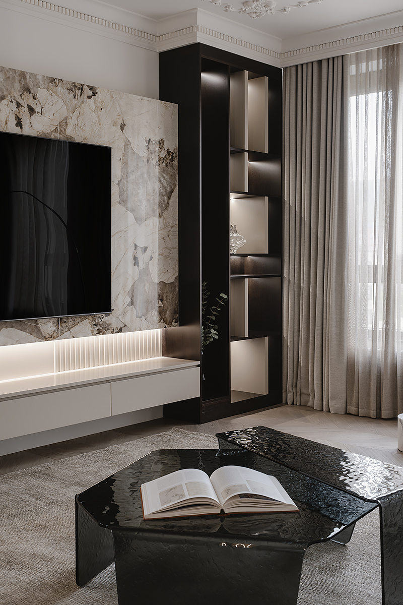 Гостиная сочетает лёгкость и выразительность: встроенные системы хранения с мягкой подсветкой, стеклянный журнальный стол с эффектом морской ряби и ТВ-зона с фактурой камня Patagonia создают современную и уютную атмосферу.