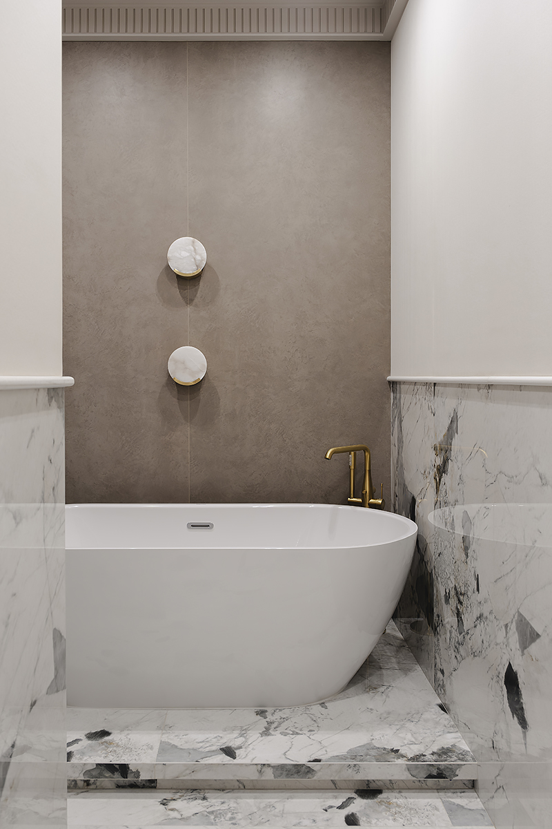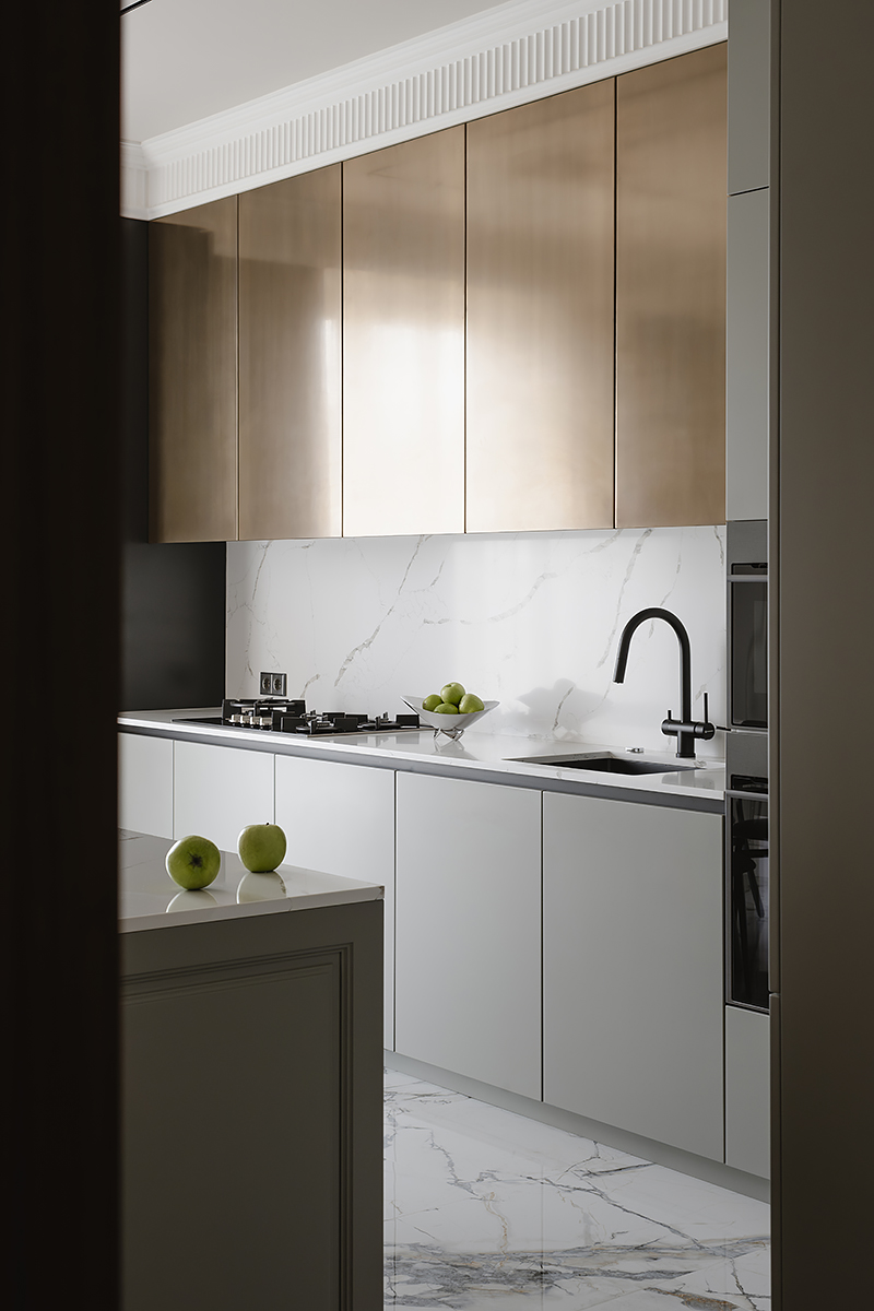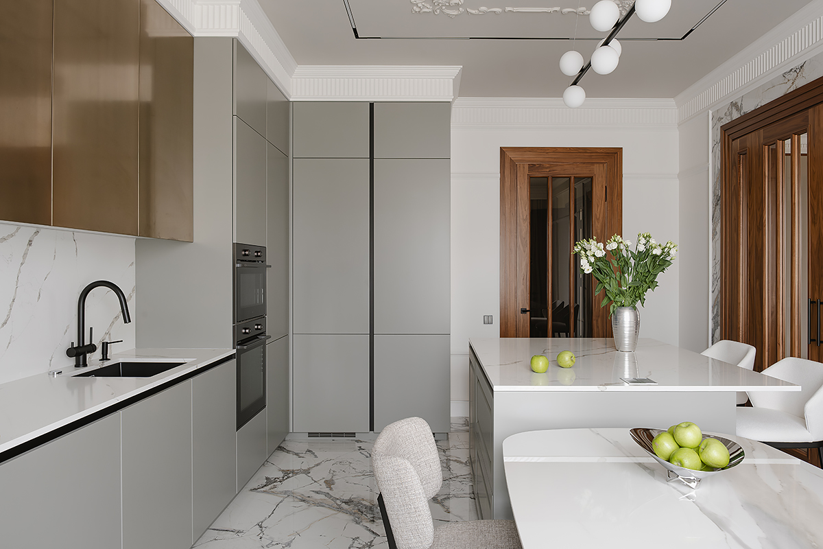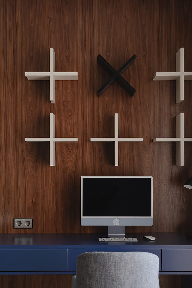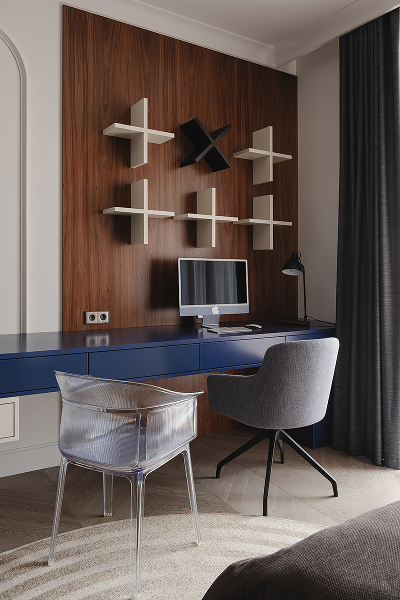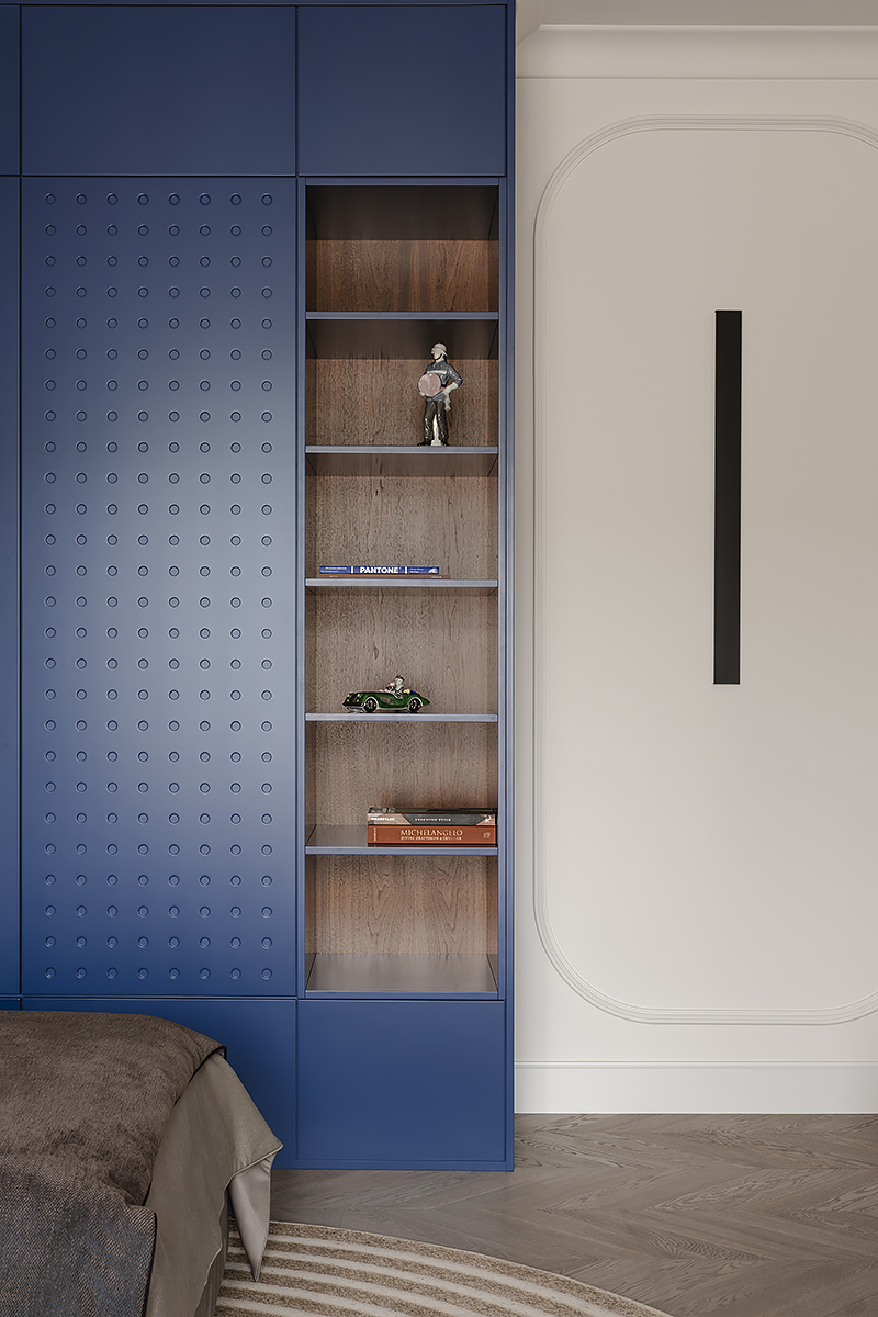 Пространство формируется за счёт чёткой геометрии, встроенных объёмов и продуманного зонирования. Внимание к пропорциям, фактурам и свету создаёт многослойное и визуально глубокое восприятие интерьера.