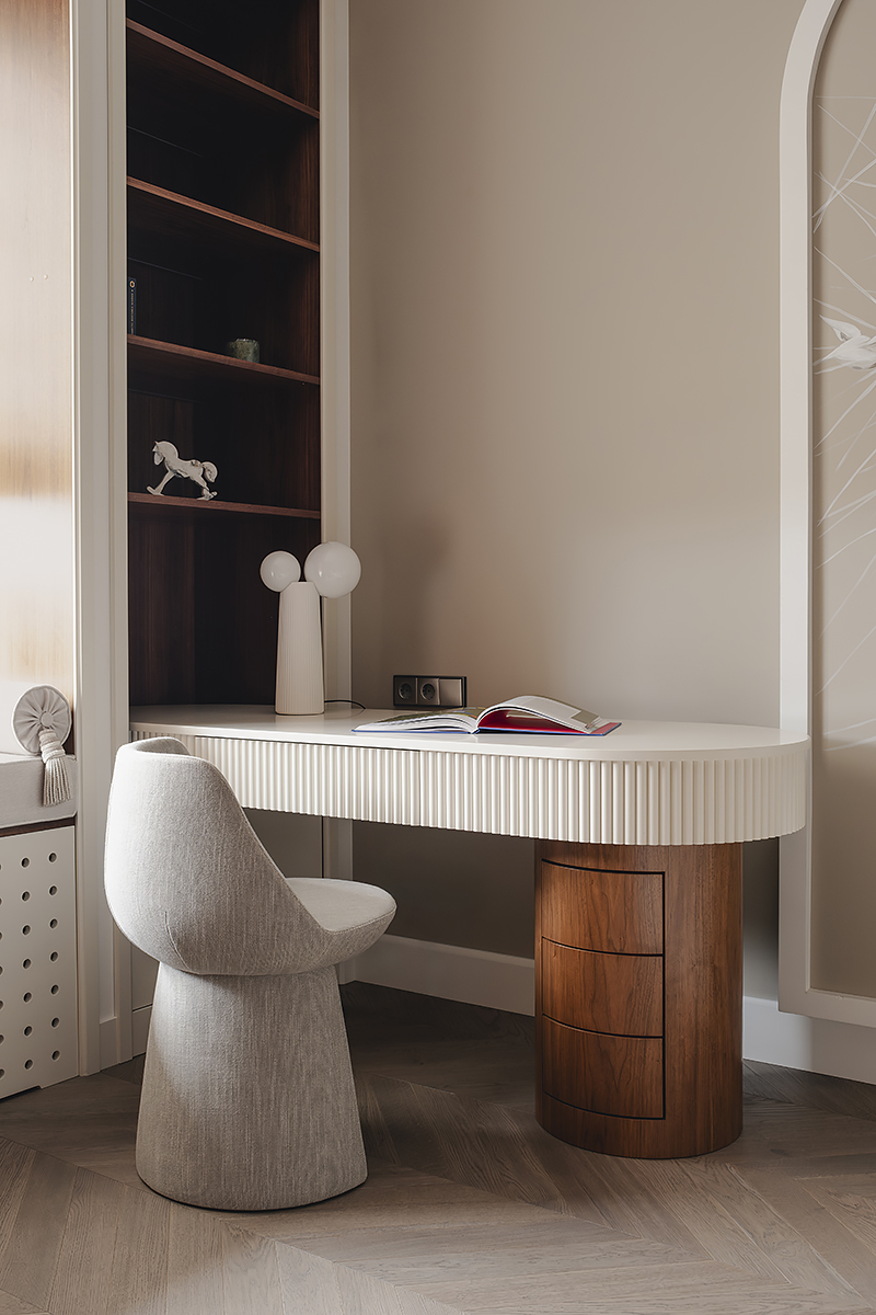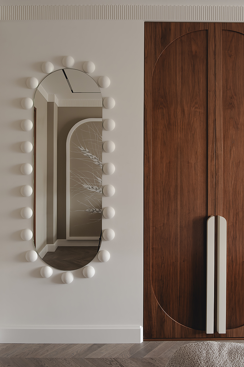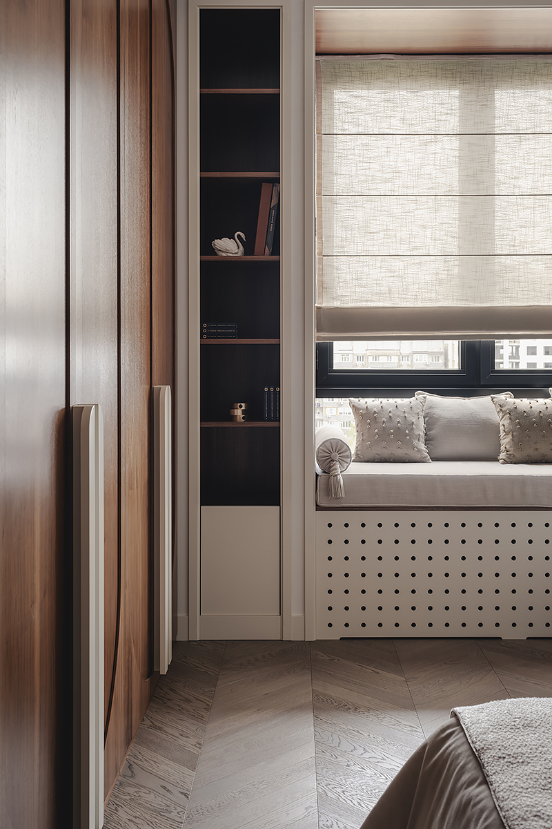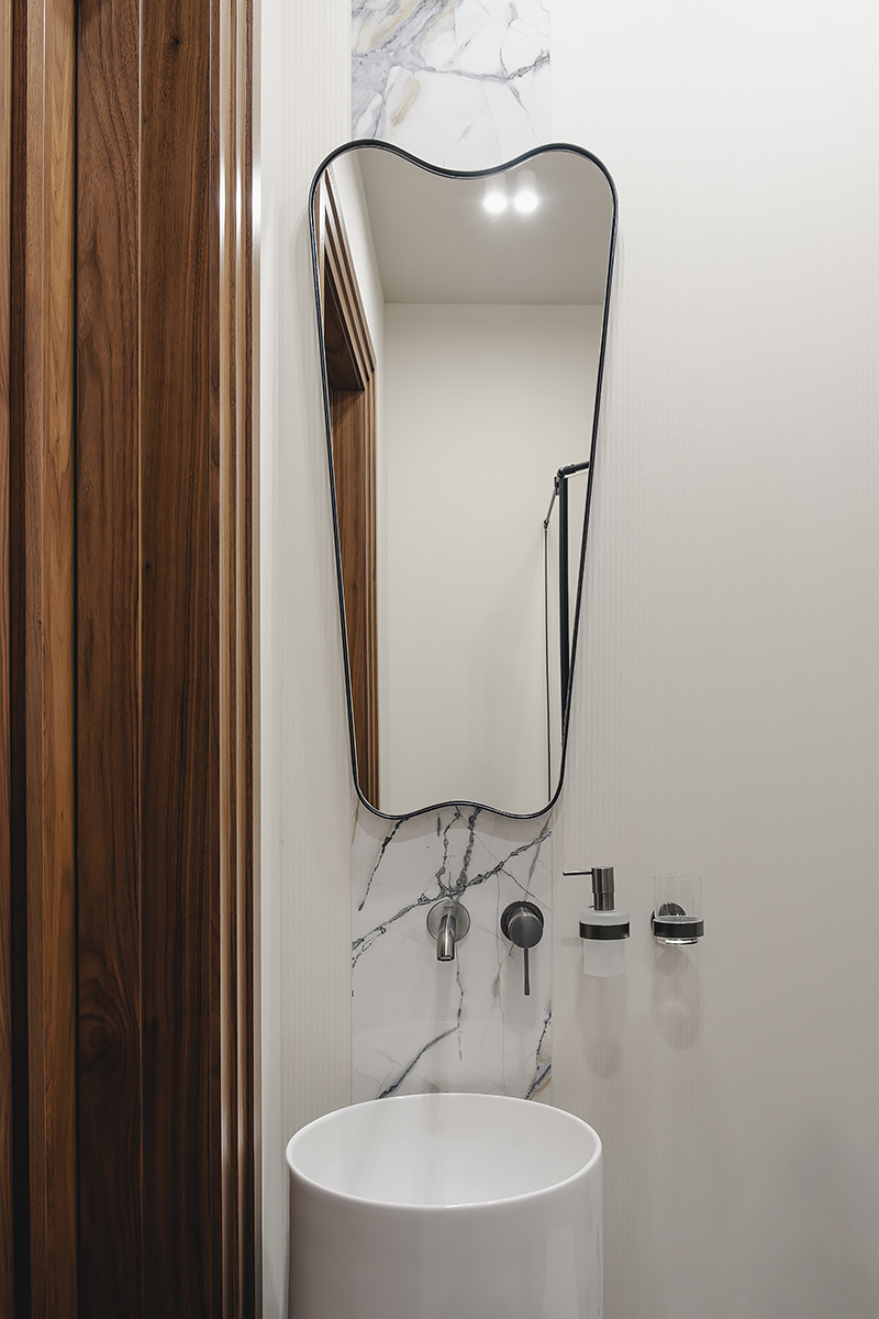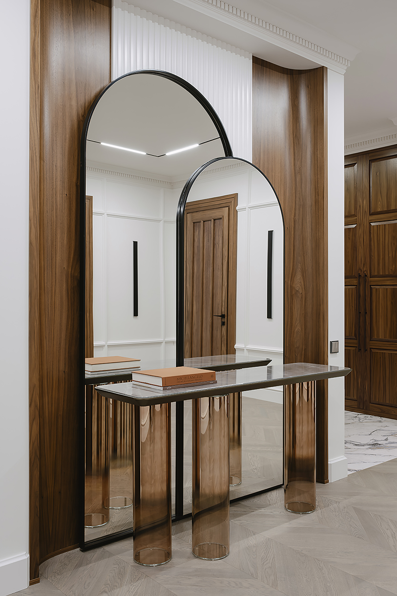 В приватных зонах использованы натуральные материалы и мягкие фактуры. Мебель и двери из американского ореха добавляют интерьеру благородства, а стекло и радиусные панели создают лёгкие акценты.