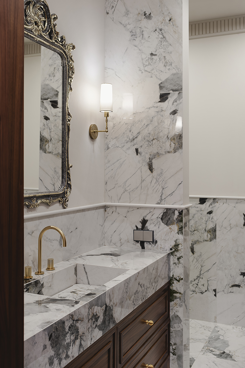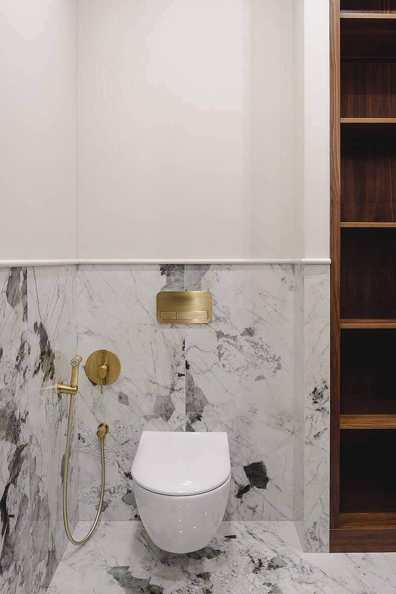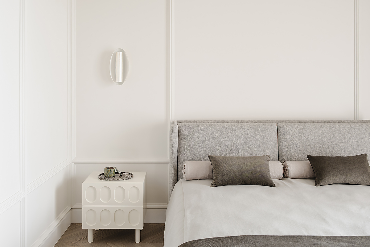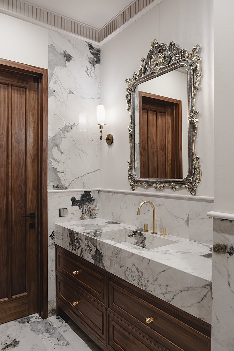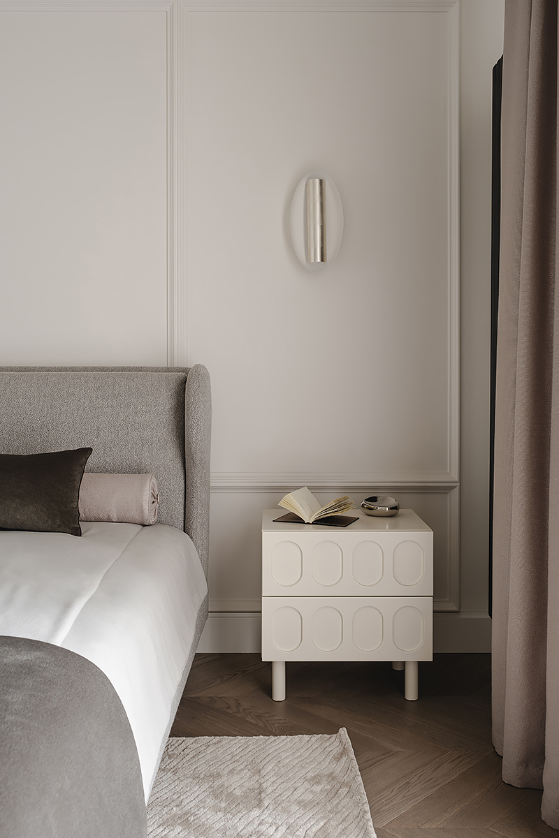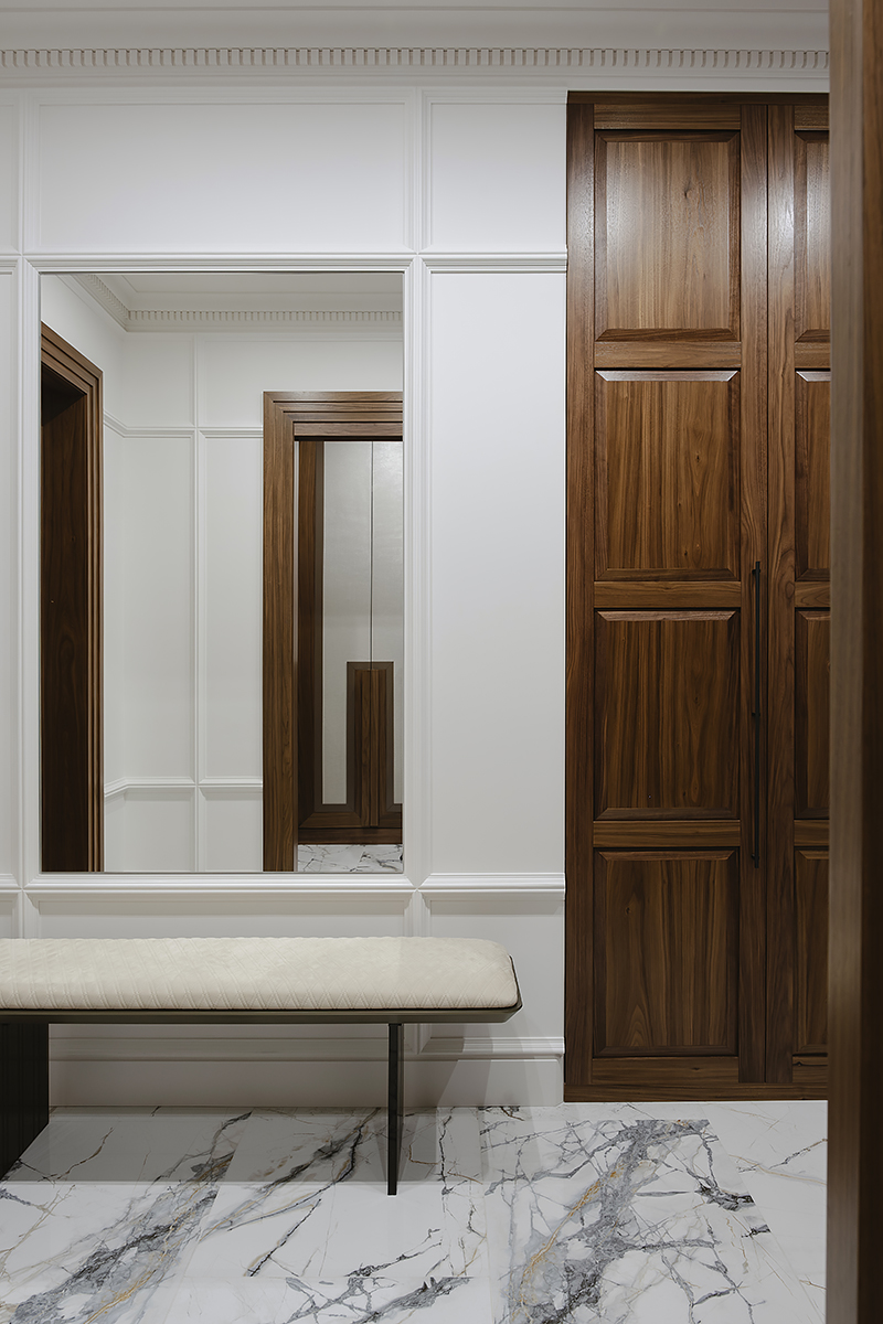 В приватных зонах использованы натуральные материалы и мягкие фактуры. Мебель и двери из американского ореха добавляют интерьеру благородства, а стекло и радиусные панели создают лёгкие акценты.