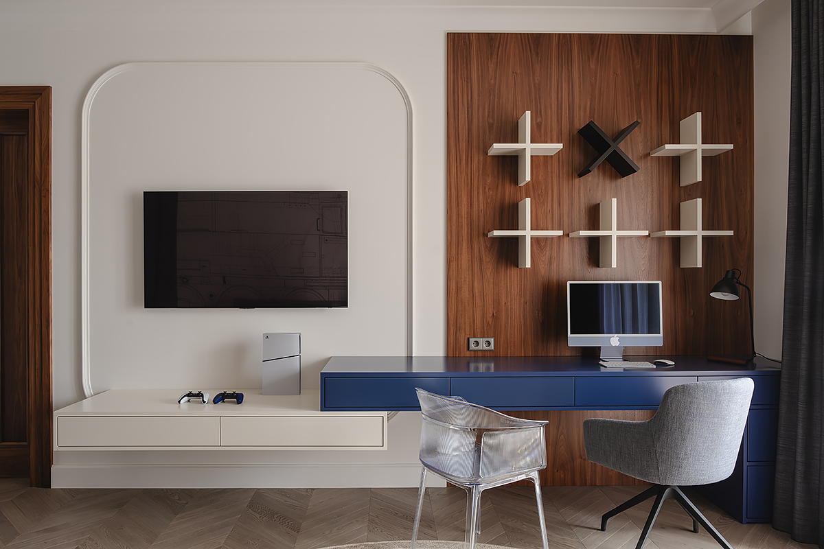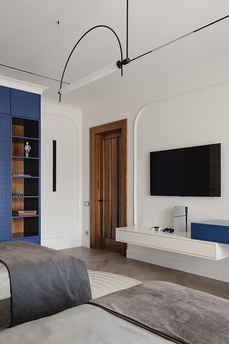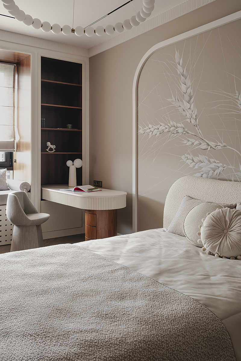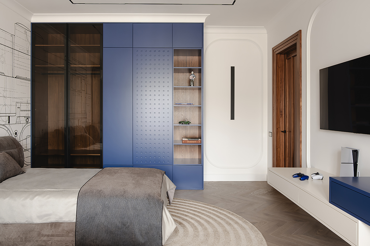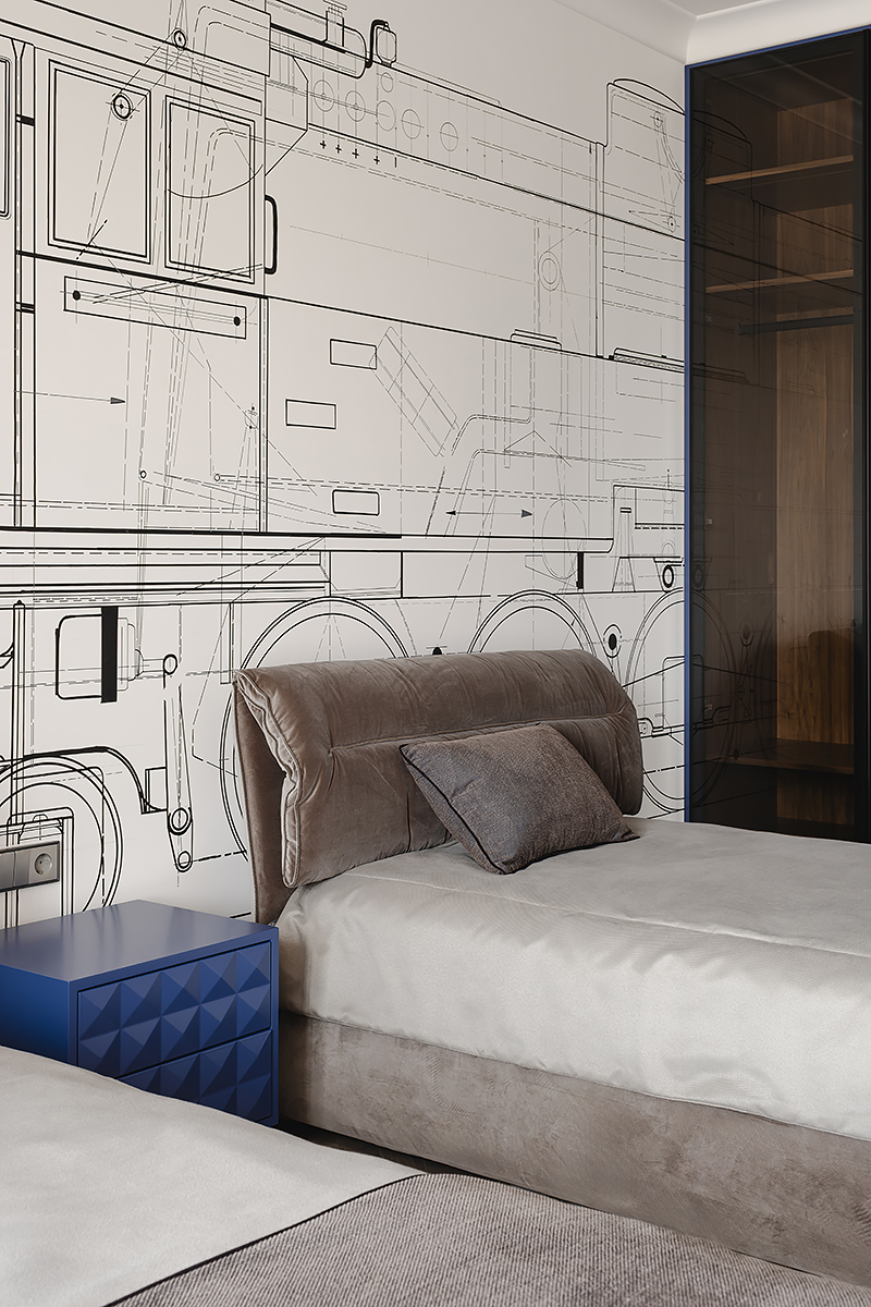 Пространство детской организовано как многофункциональная среда для жизни и развития. Особую индивидуальность задаёт авторская роспись — детализированный рисунок в виде чертежа.