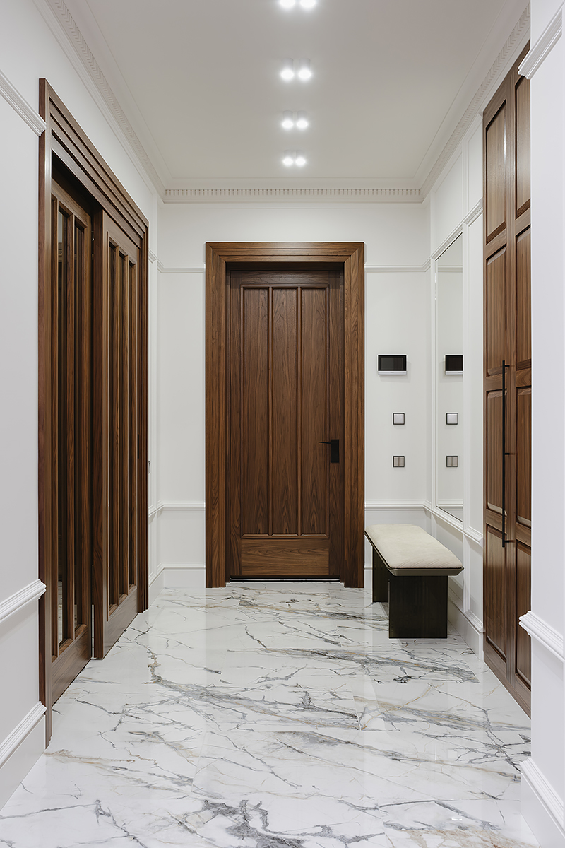 Натуральный дубовый паркет Coswick, уложенный «французской ёлкой», формирует основу интерьера, задаёт ритм пространству и объединяет его в цельную композицию, оставаясь элегантным и сдержанным.