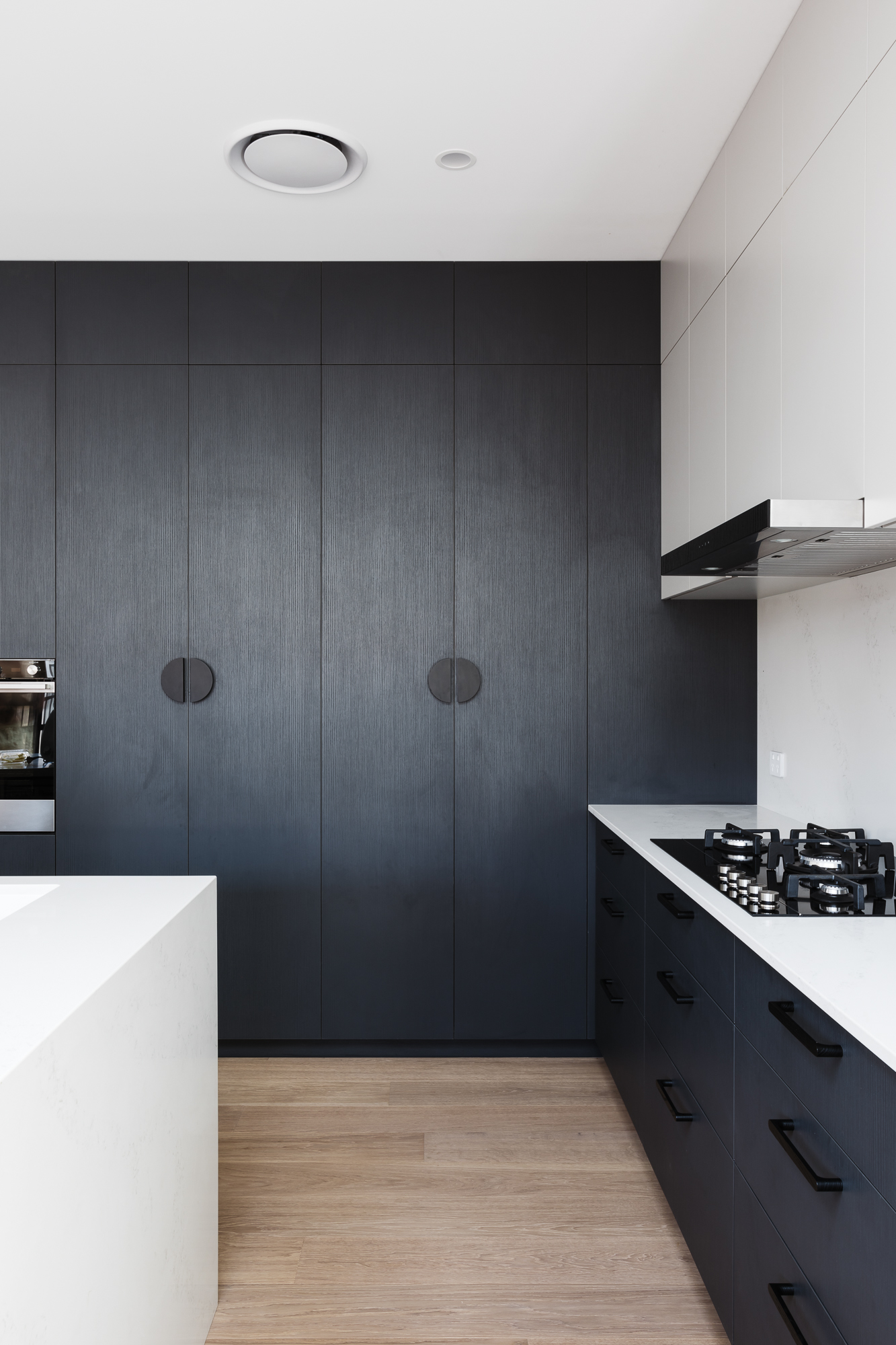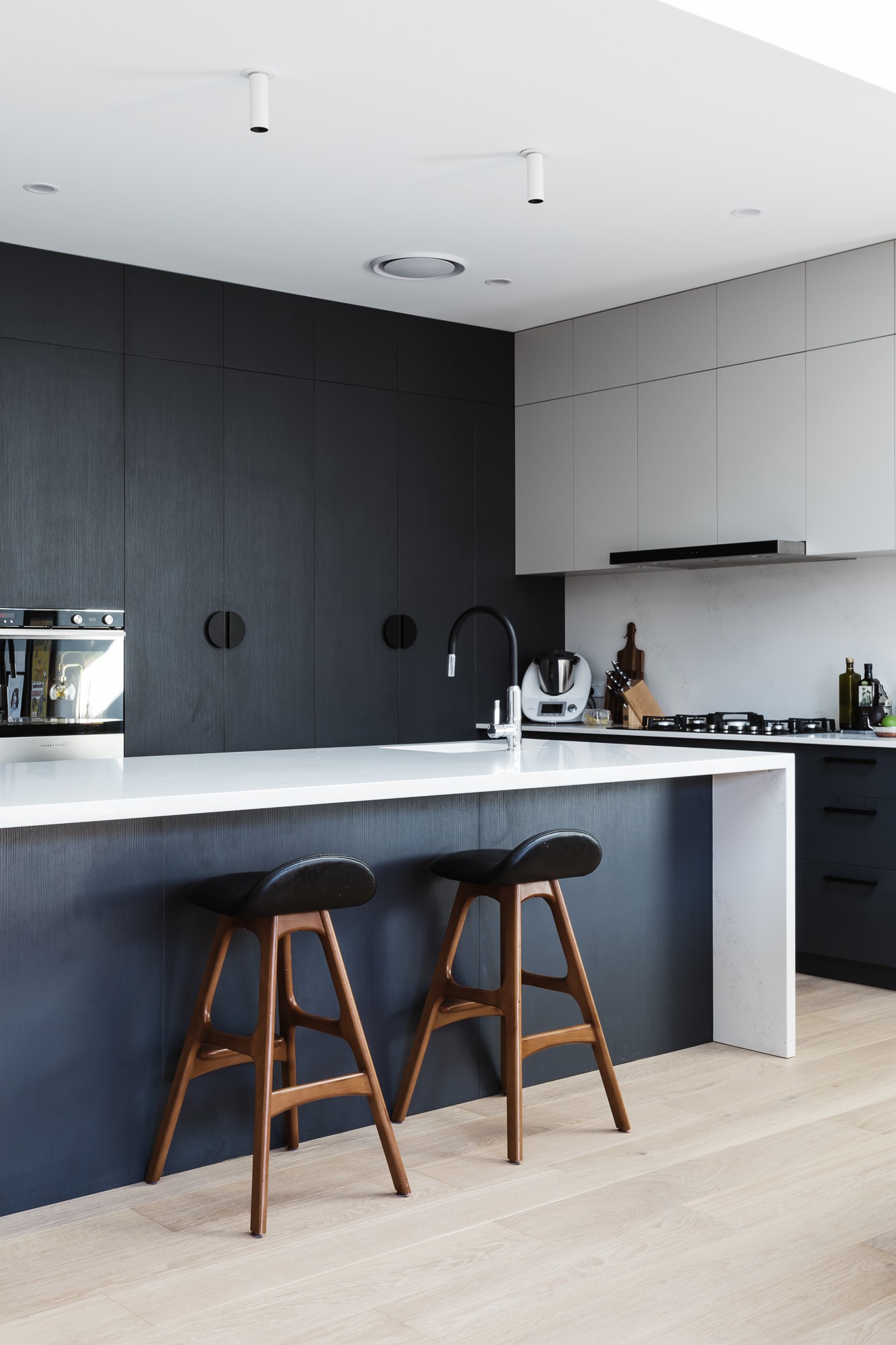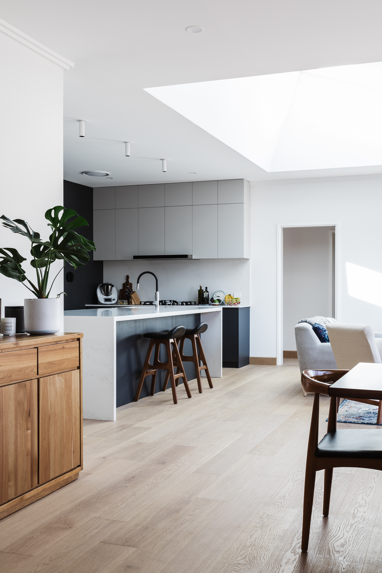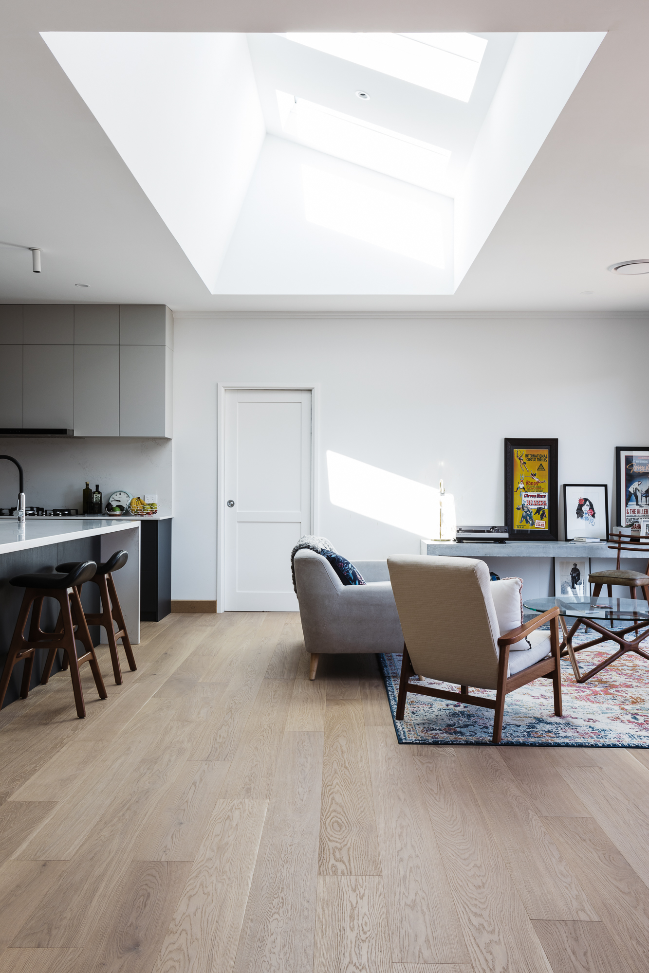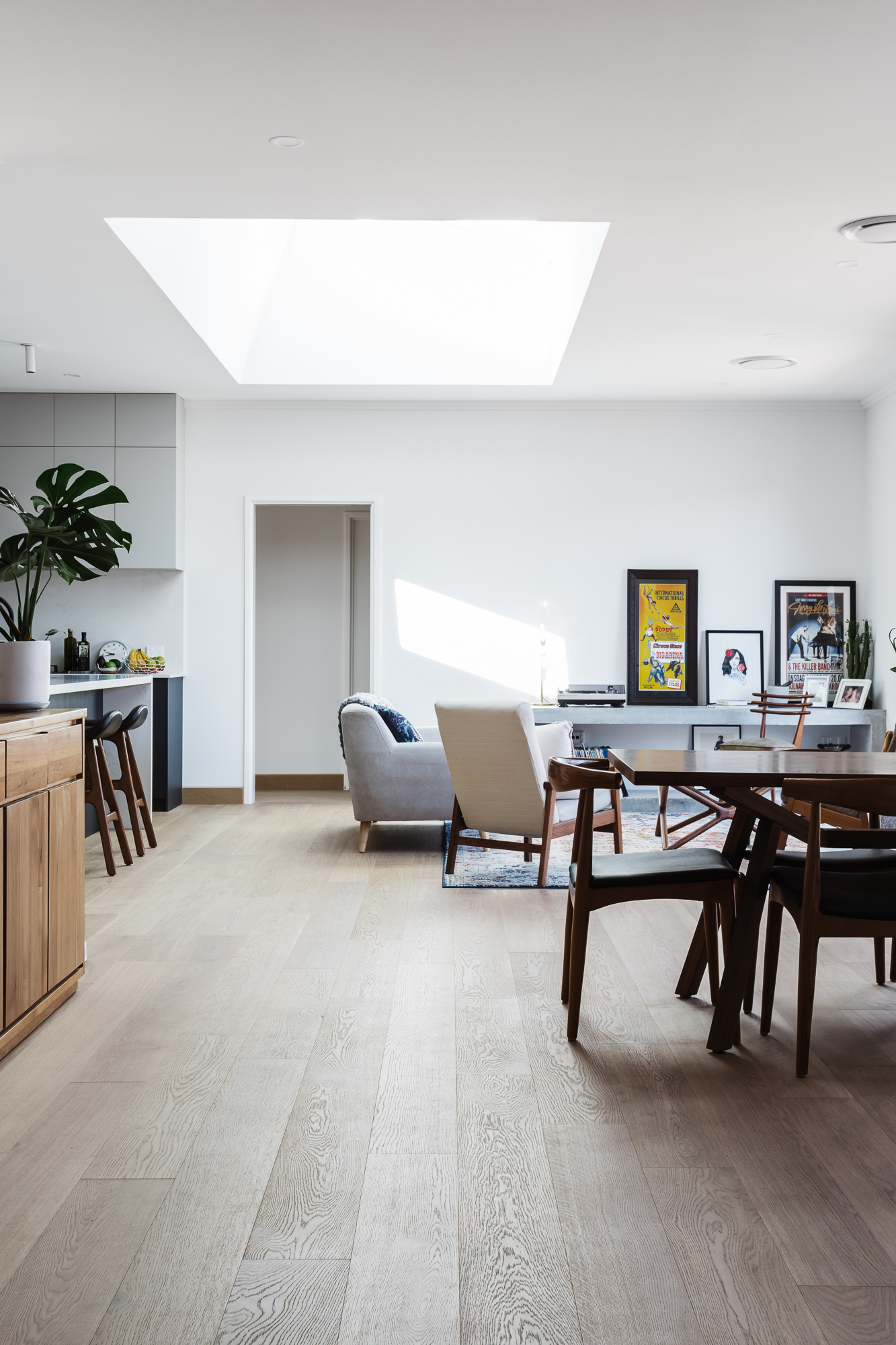 Удивительно гармоничный интерьер от нашего австралийского партнера Woodpecker Flooring. Все построено на игре контрастов – цвета, материалов, стилей, освещения. Холодный камень – и натуральное дерево. Белые, дающие прохладу стены – и естественный теплый оттенок дубового паркета, который смягчает черно-белый контраст в отделке кухни. Строгая, лаконичная кухонная зона – и эклектичная, комфортная зона гостиной.