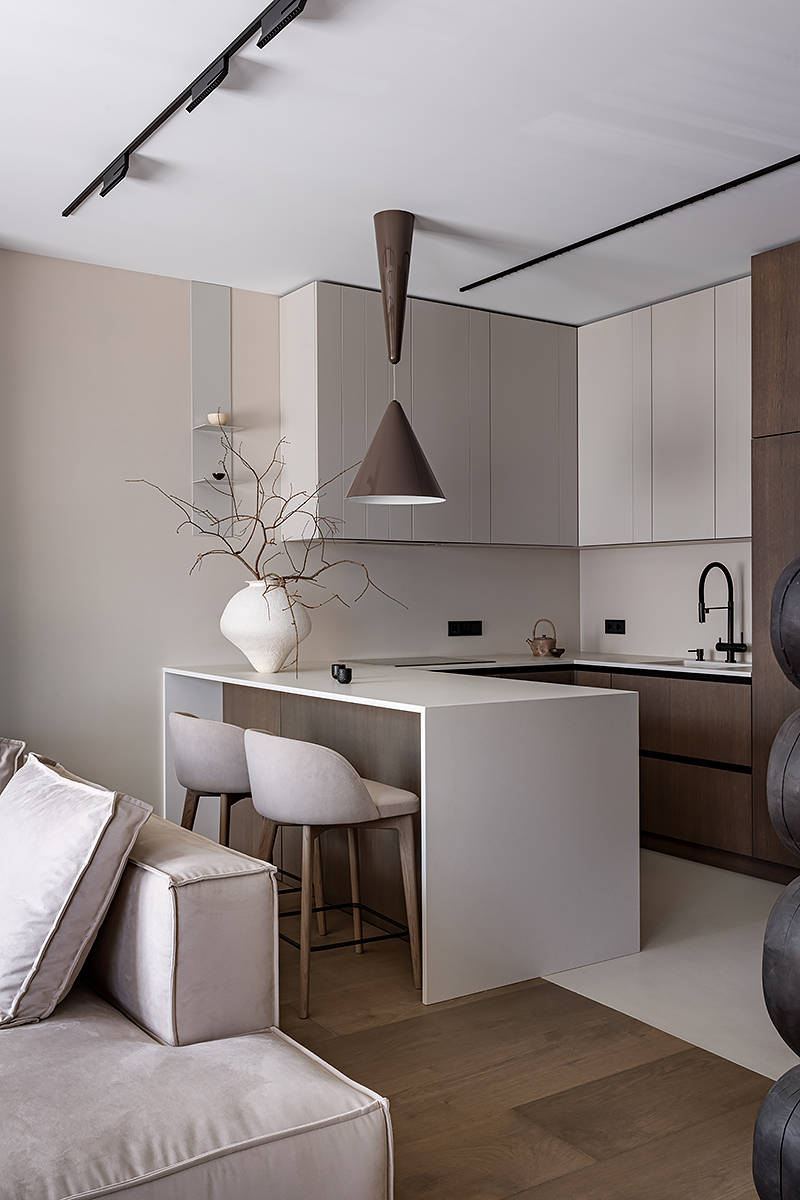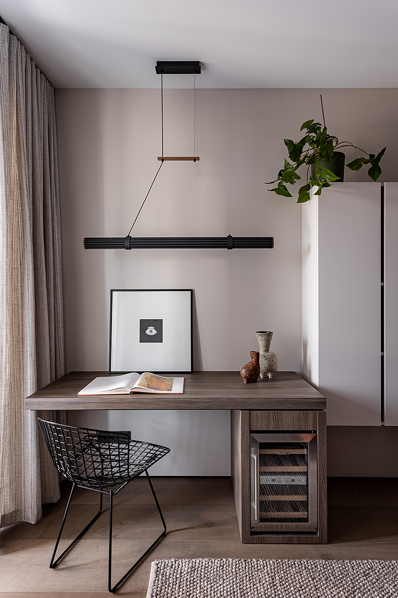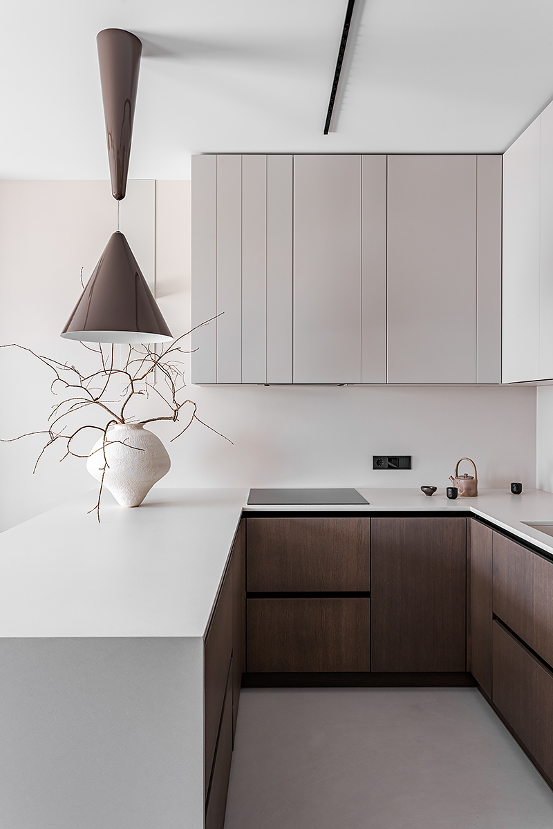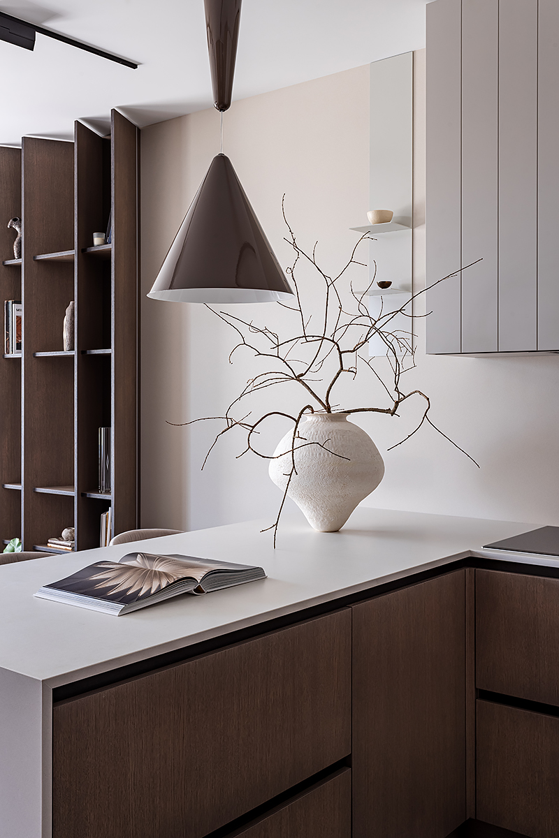 Идея мягко «обнимающего» пространства стала основой для интеграции восточной философии и искусства. Интерьер оживляют работы белорусских художников и ремесленников: графика тушью, акварели, керамика ручной работы. Эти детали формируют атмосферу баланса света и тени, дня и ночи, лёгкости и глубины.