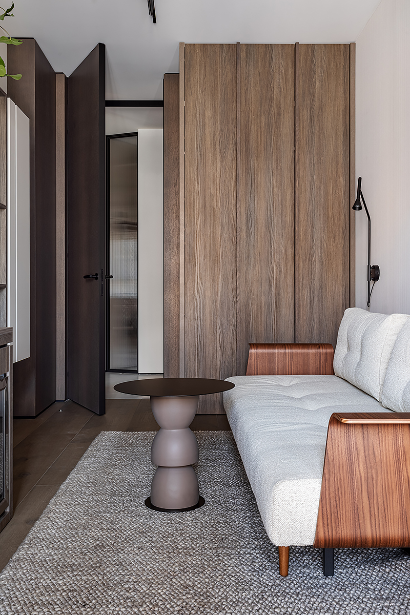 Как создать пространство, выдержанное в духе минимализма, как конструктивно, так и визуально? Авторы проекта решили уйти от активных цветовых акцентов и построить интерьер на сложной, глубокой палитре greige — оттенков между серым и бежевым, в меру тёплых, но сохраняющих дымчатую глубину. В роли единственных ярких акцентов выступили природные материалы: рыжая кожа, шпон редких пород, металл.