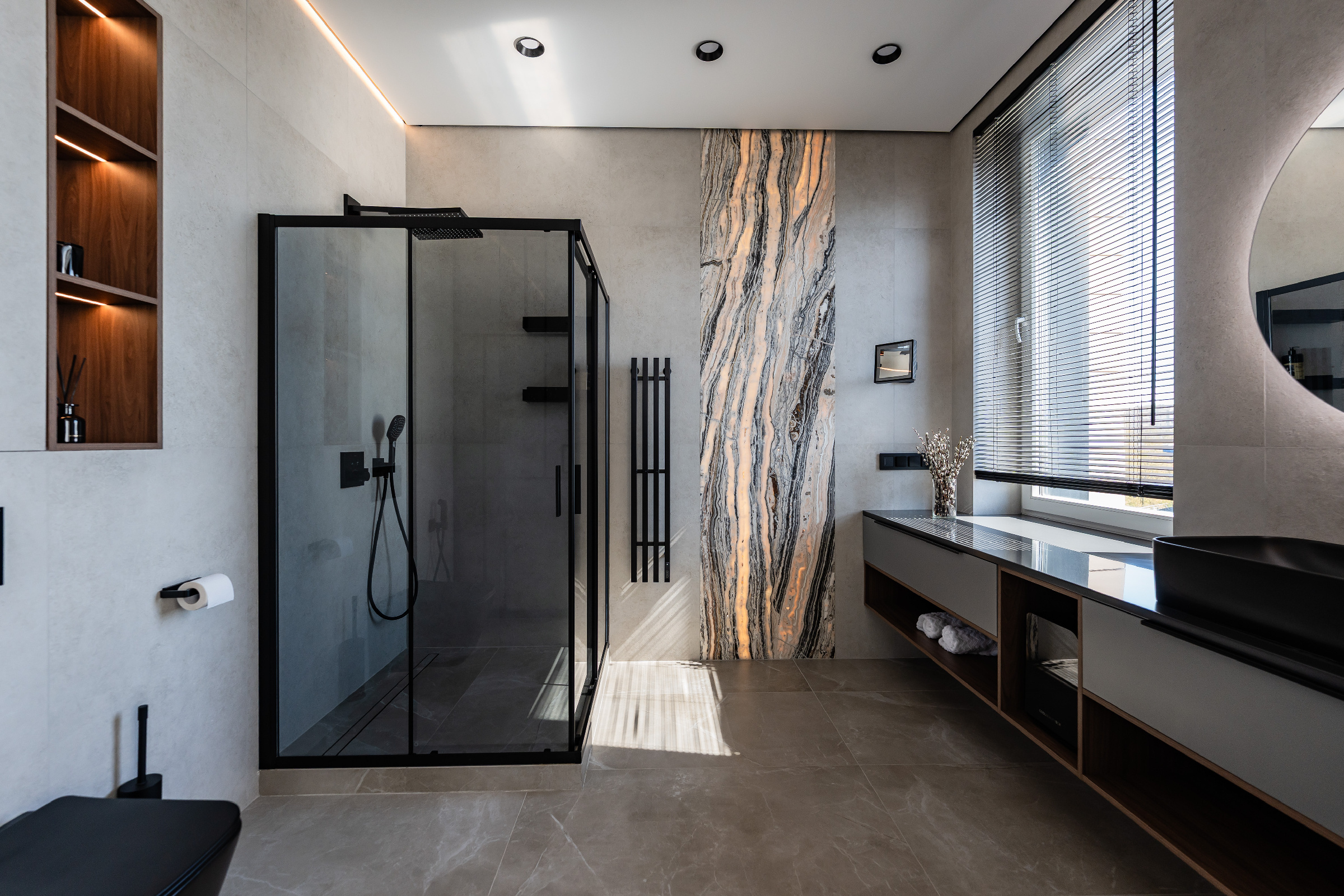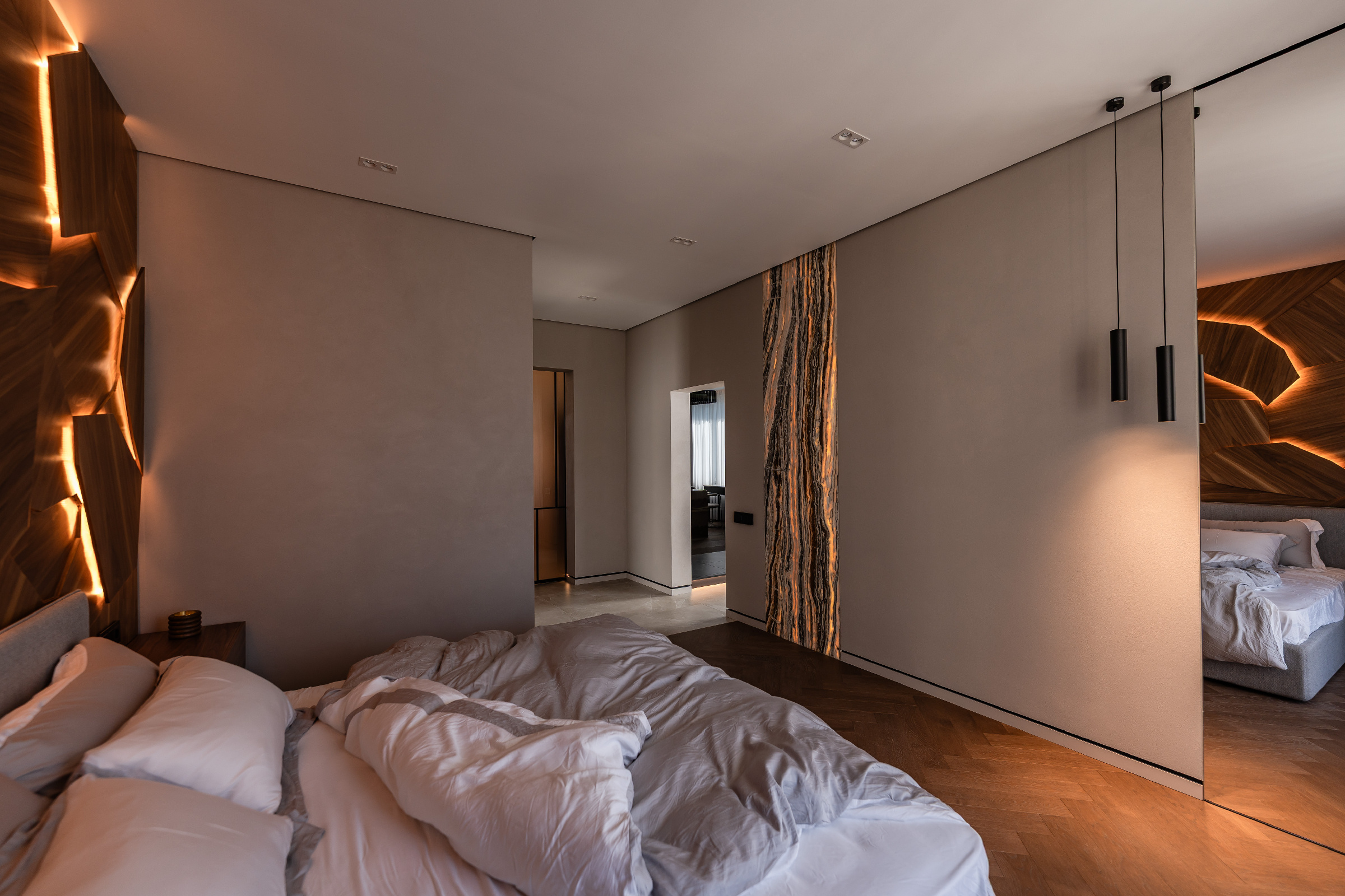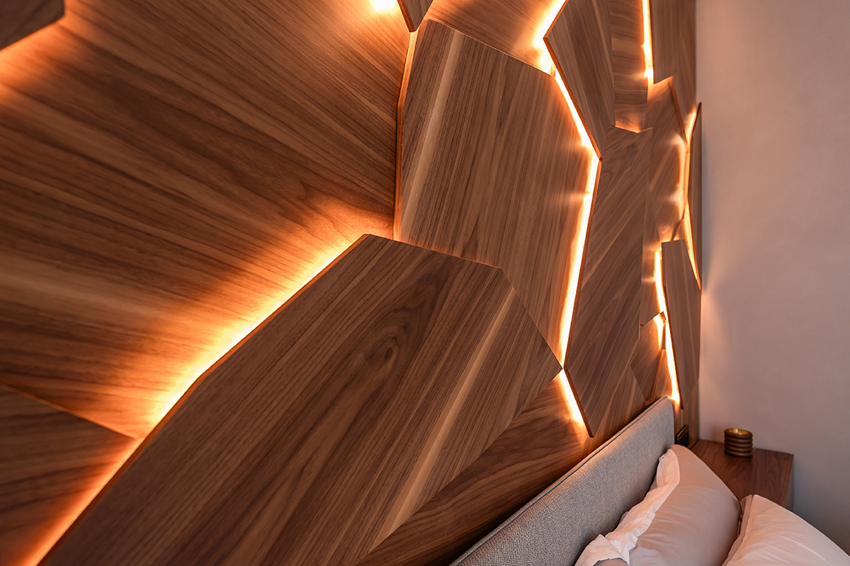 Главной идеей проекта стала любовь заказчиков к дереву и камню. В отделке использованы три породы древесины и два вида натурального камня — сочетание, придающее интерьеру естественную теплоту и благородство. Особое место заняли стеновые панели из натурального шпона, созданные по индивидуальному проекту и собранные в многоуровневый пазл с эффектной подсветкой.