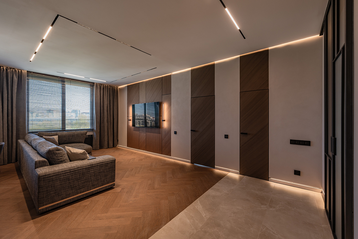 Сдержанные серые стены, мебель с элементами дуба и ореха, подсвеченный оникс и кварцит создают богатую палитру фактур и оттенков. А продуманное освещение — от трековых систем до мягкой подсветки плинтусов — делает пространство по-настоящему живым и уютным.