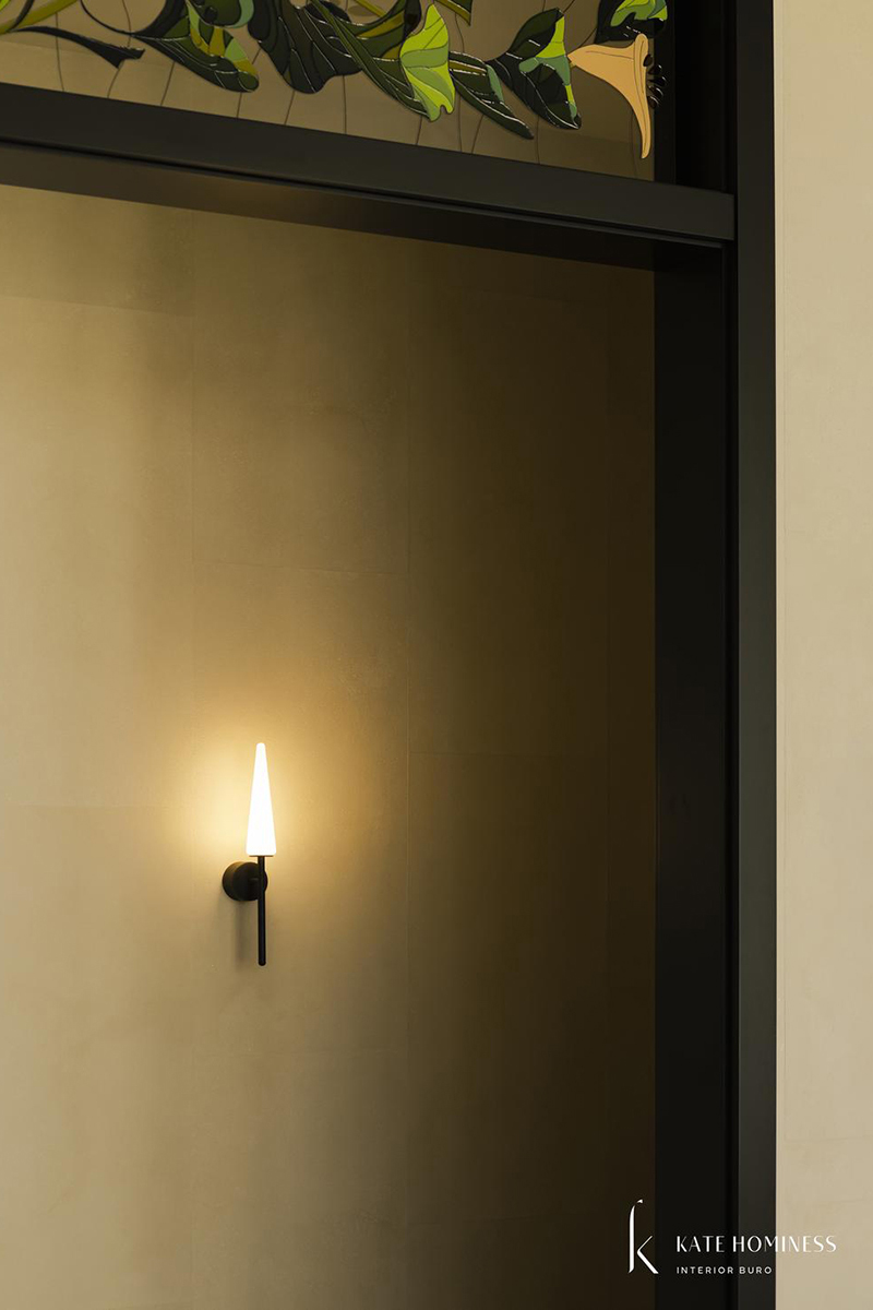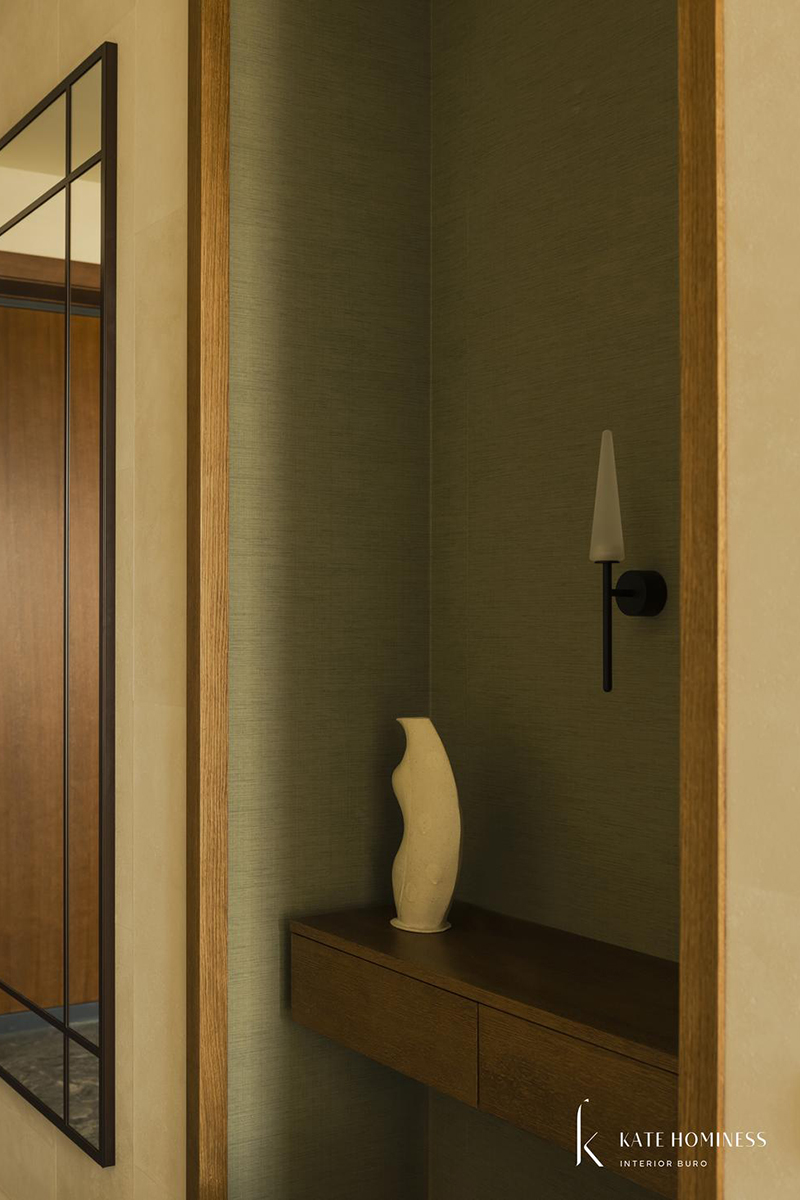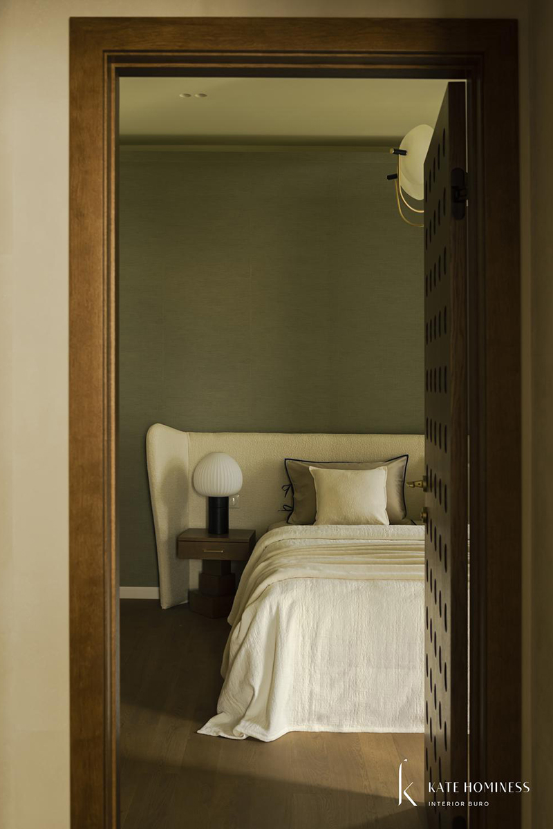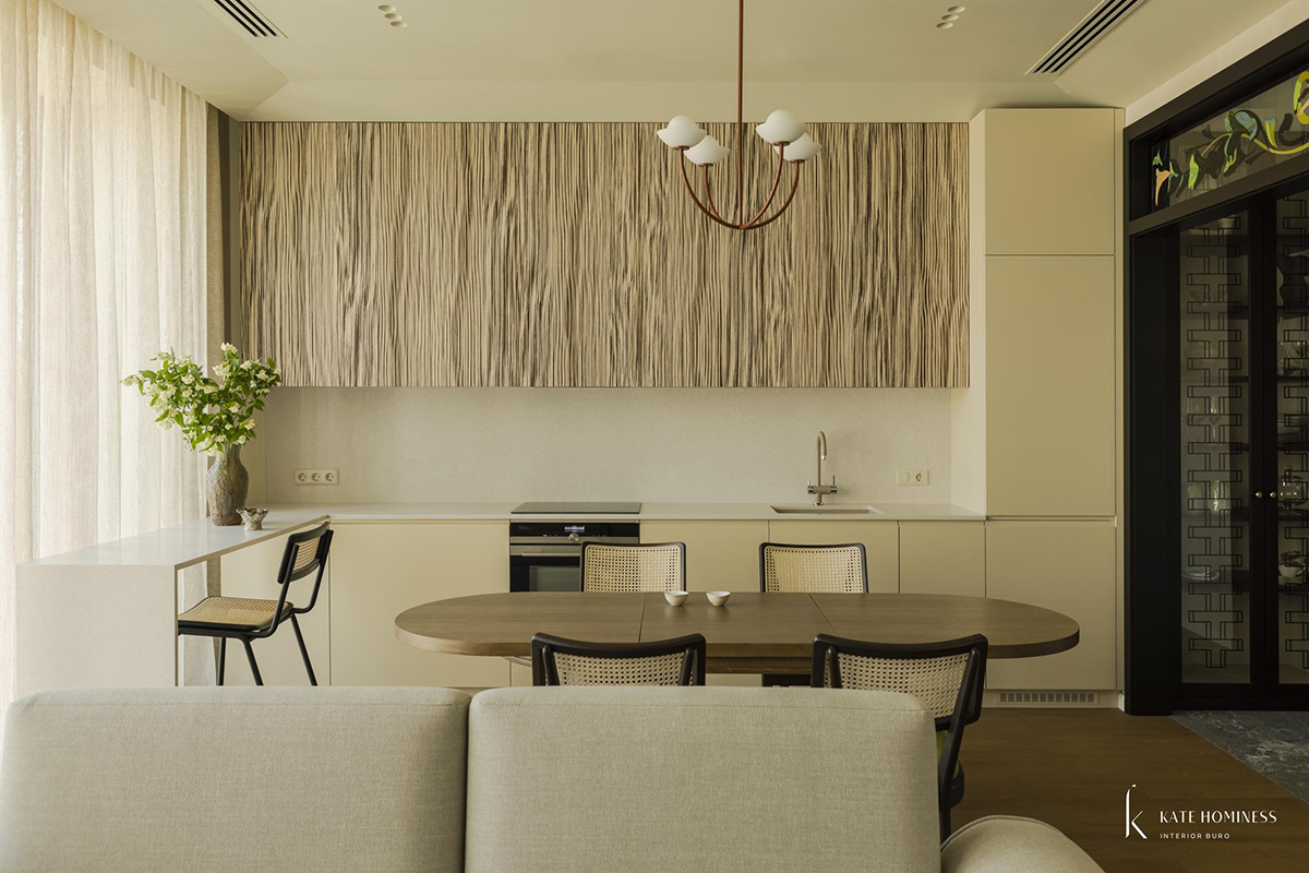 В отделке стен дизайнеры добились мягкого объёма и игры теней, сохранив естественность и спокойствие. Круглые фрезеровки на дверях добавляют интерьеру глубины и многослойности.