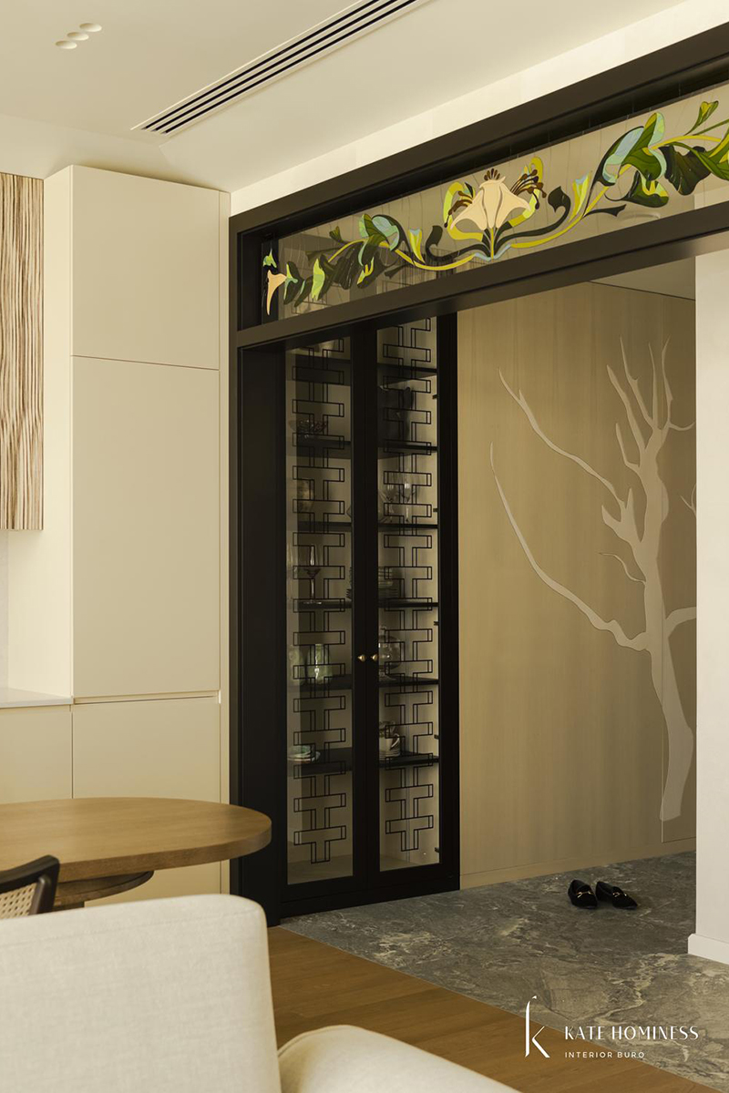 Проект получил своё название благодаря многофактурности и любви к природе. Уже при входе внимание привлекают фасады из фрезерованного шпона, напоминающие ветви деревьев и витраж с художественной росписью. Плитка «калаката» с выразительной структурой камня под сланец подчёркивает идею естественности, а стеклянный стеллаж с геометричным принтом создаёт ощущение лёгкости и утончённости.