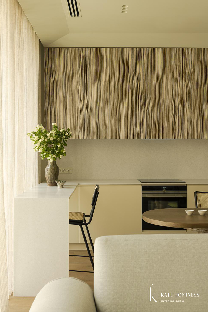 Кухню стремились «растворить» в пространстве — сделать её функциональной, но при этом декоративной. Верхние фасады оформлены как панно из дизайнерского шпона, органично переходящие в общую композицию.