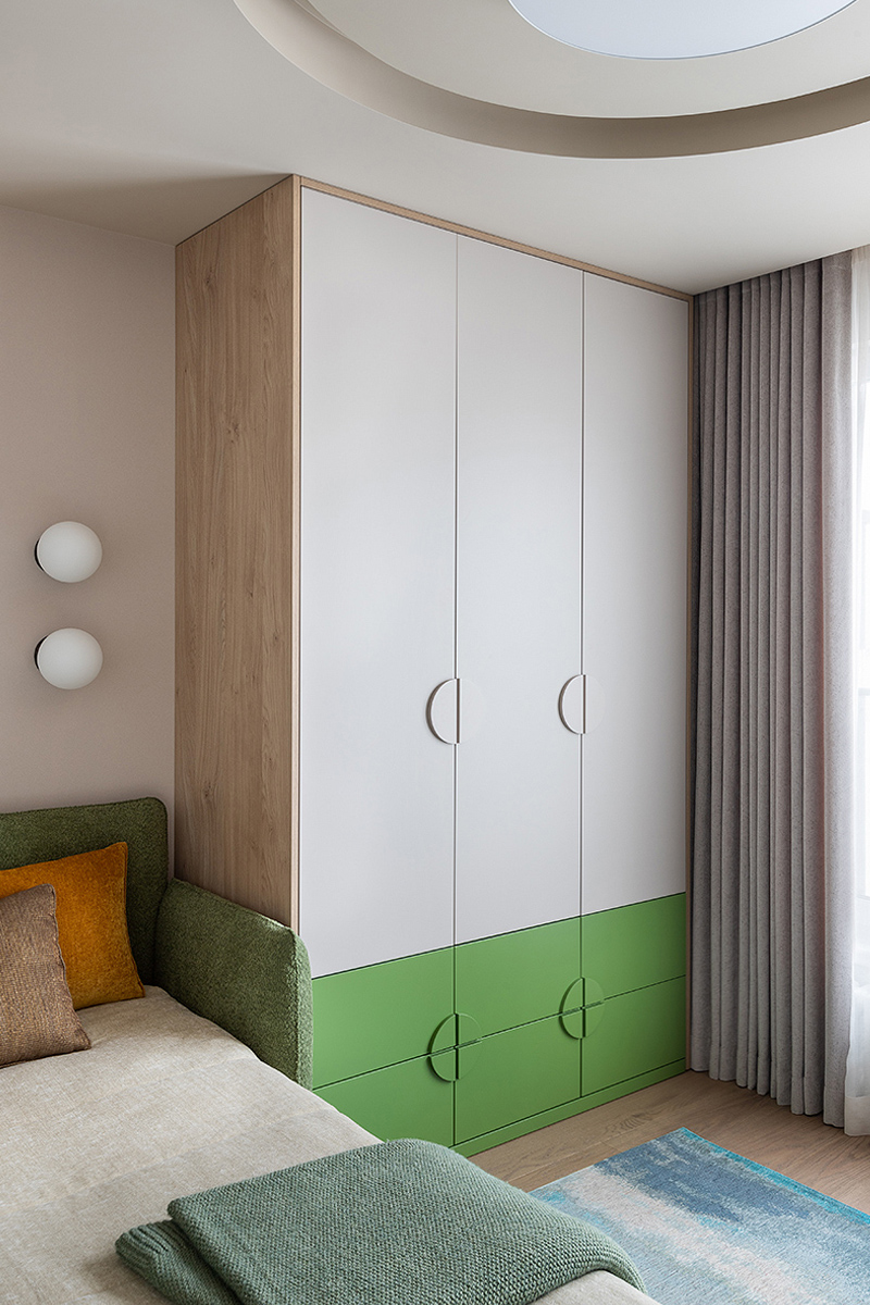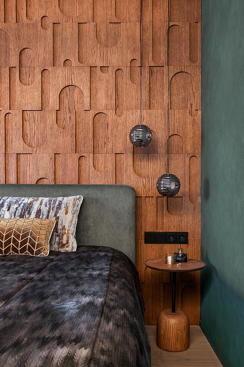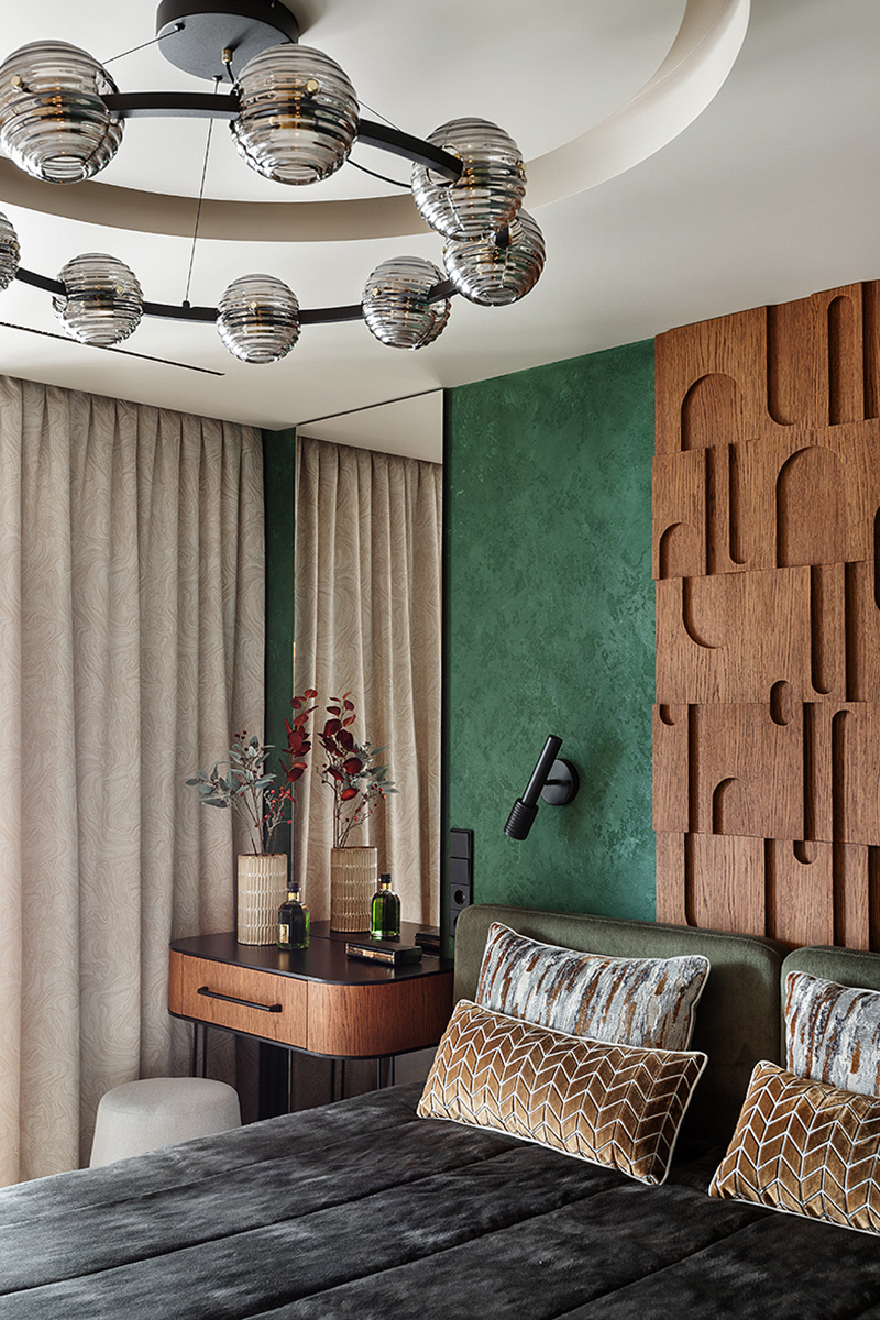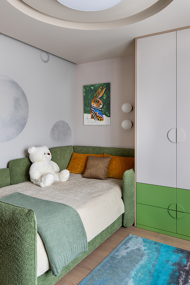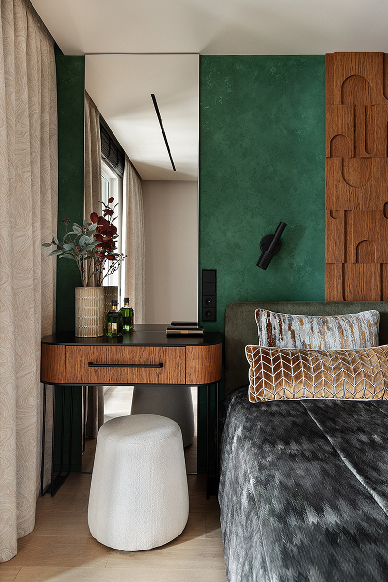 Несколько тонов шпона и разнообразие зелёных акцентов делают пространство многогранным: оно постоянно открывается с новой стороны, позволяя рассматривать детали и наслаждаться нюансами. Компактная кухня с островом продумана до мелочей и сочетает в себе функциональность и лёгкость. Гостиная наполнена светом и теплом дубового шпона, а вертикальные рейки и зеркальные вставки создают игру объёмов и ощущение воздуха. В спальне акцентом стала уникальная декоративная панель, созданная вручную, которая превращает небольшую комнату в камерное и атмосферное пространство. Особое внимание уделено детским: они выполнены в том же стиле, что и весь интерьер, но дополнены яркими акцентами и функциональными решениями для игр и учёбы.