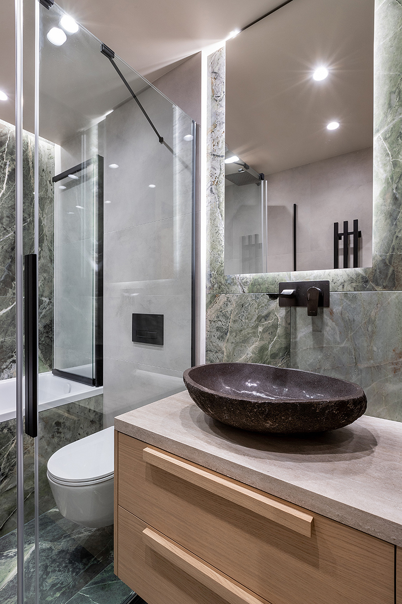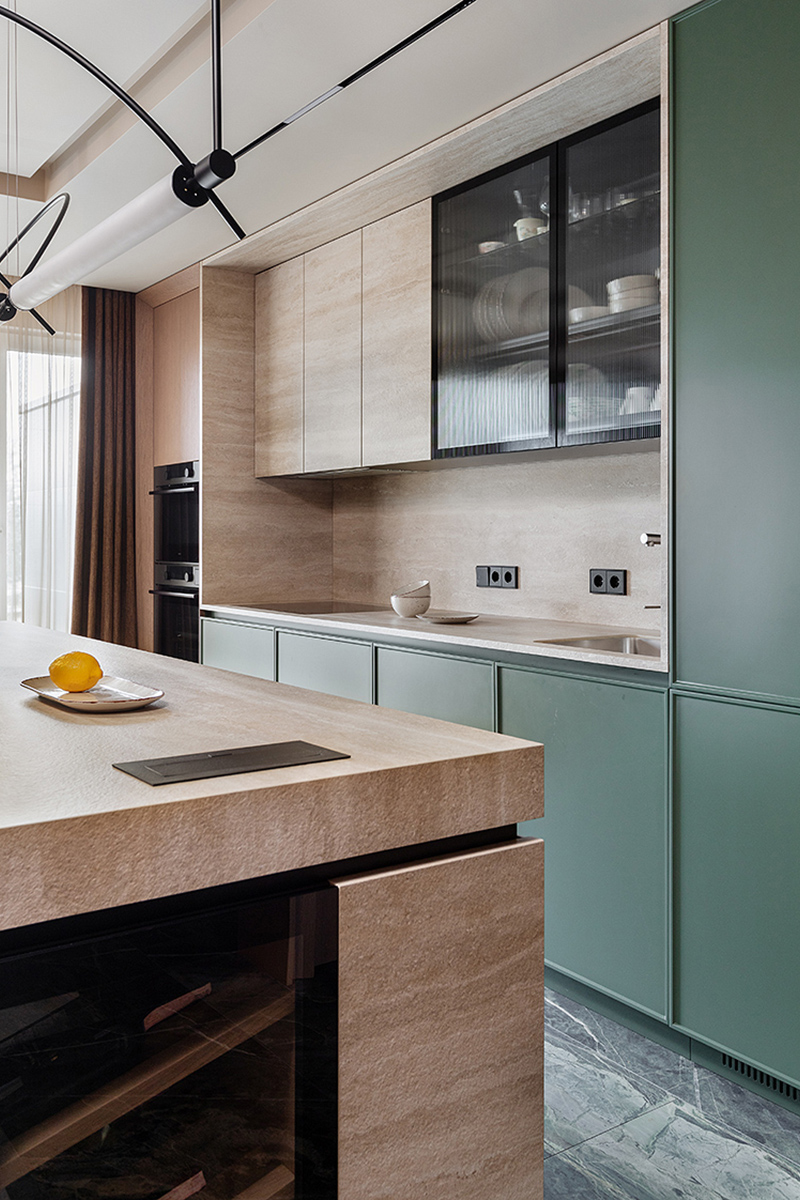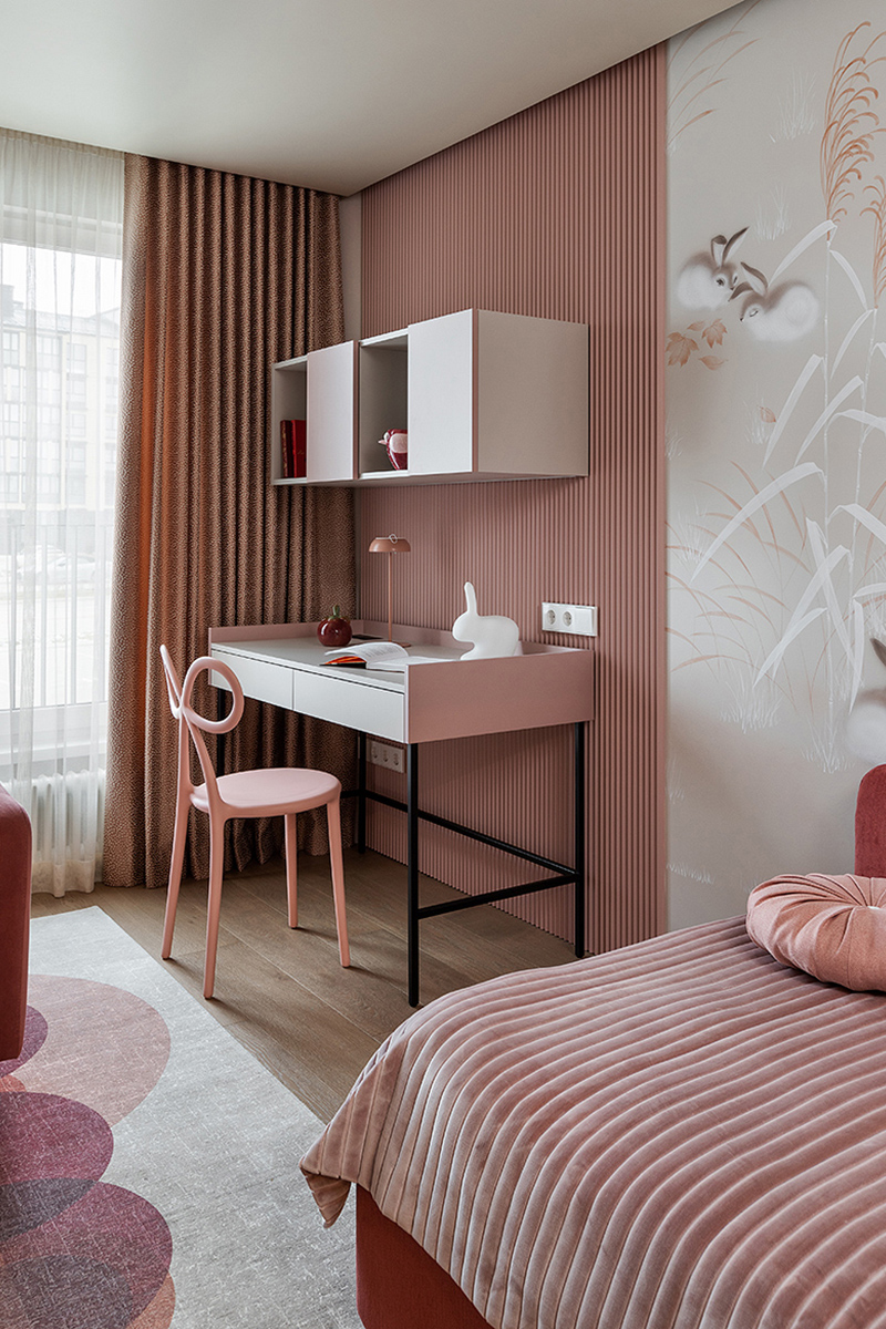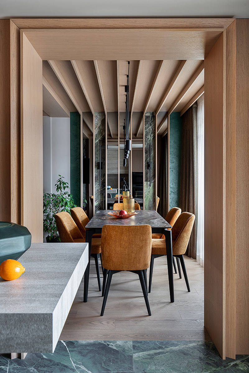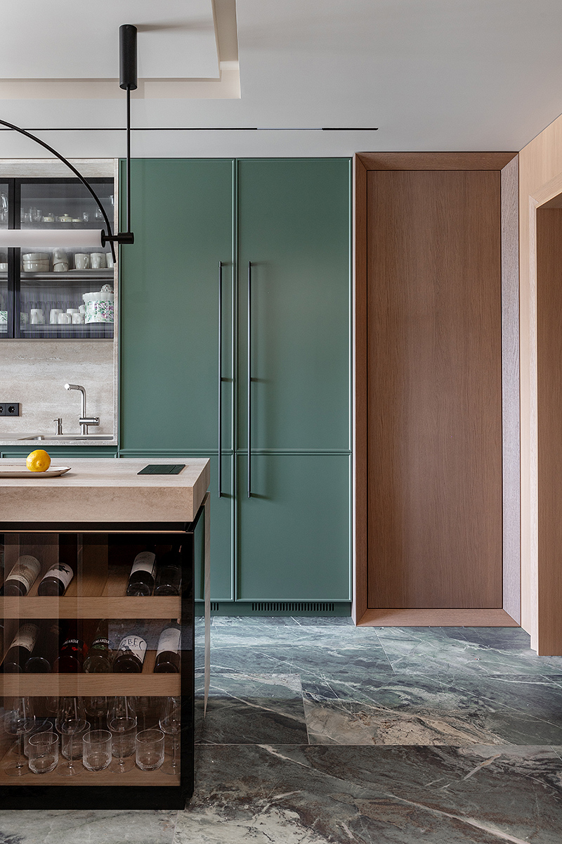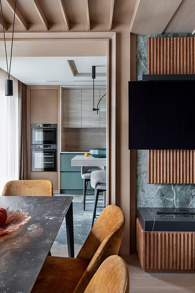 Несколько тонов шпона и разнообразие зелёных акцентов делают пространство многогранным: оно постоянно открывается с новой стороны, позволяя рассматривать детали и наслаждаться нюансами. Компактная кухня с островом продумана до мелочей и сочетает в себе функциональность и лёгкость. Гостиная наполнена светом и теплом дубового шпона, а вертикальные рейки и зеркальные вставки создают игру объёмов и ощущение воздуха. В спальне акцентом стала уникальная декоративная панель, созданная вручную, которая превращает небольшую комнату в камерное и атмосферное пространство. Особое внимание уделено детским: они выполнены в том же стиле, что и весь интерьер, но дополнены яркими акцентами и функциональными решениями для игр и учёбы.
