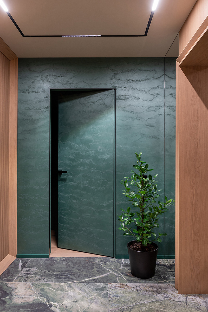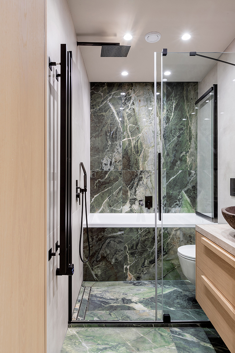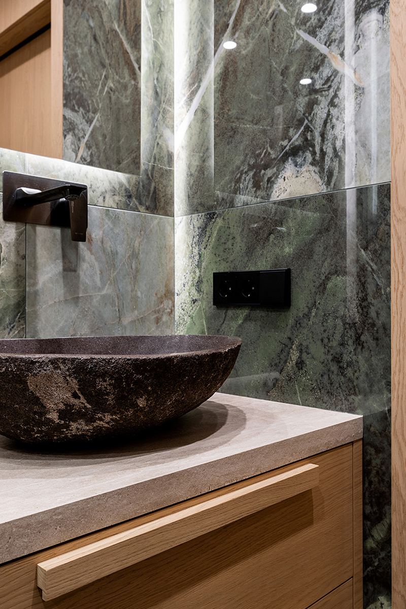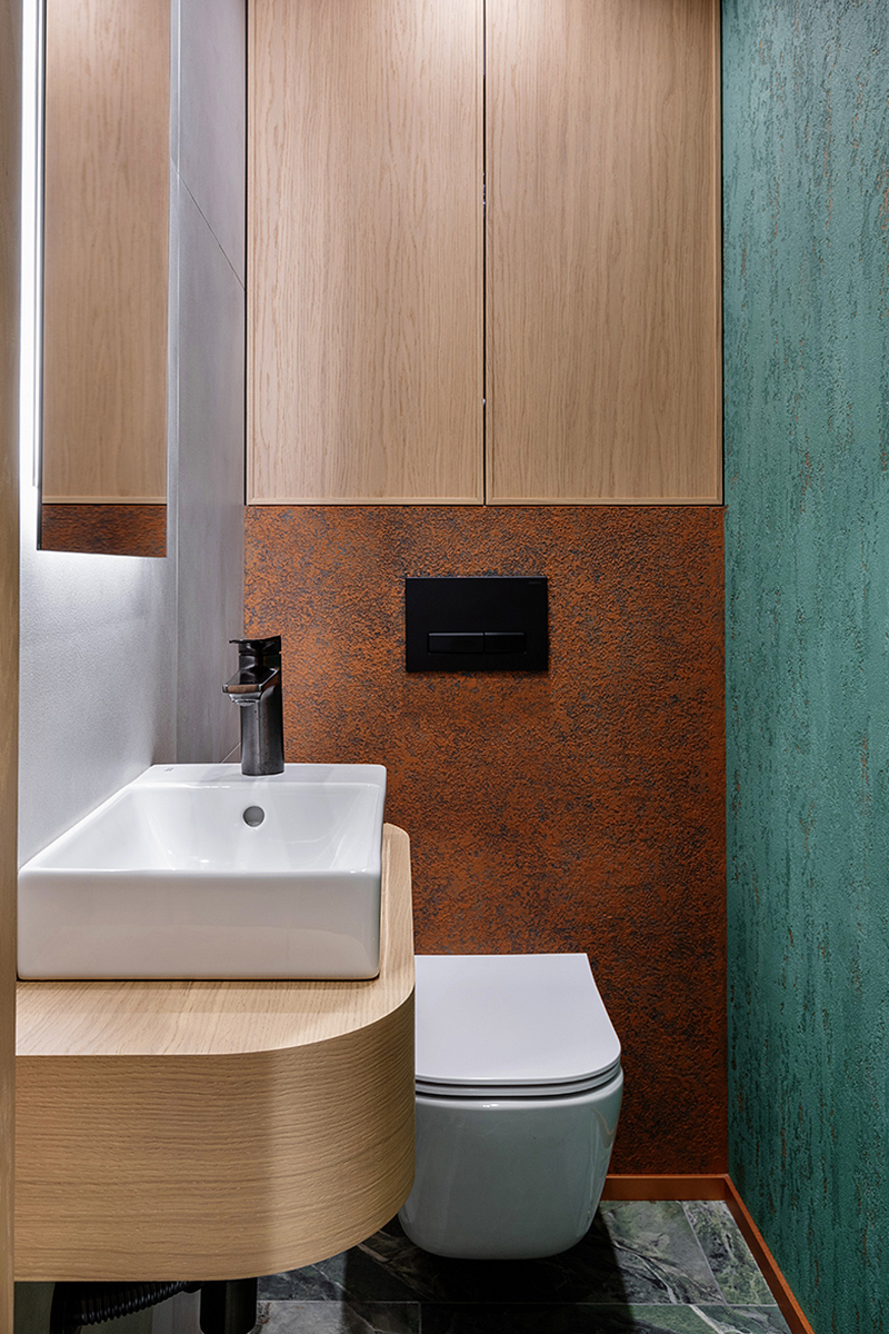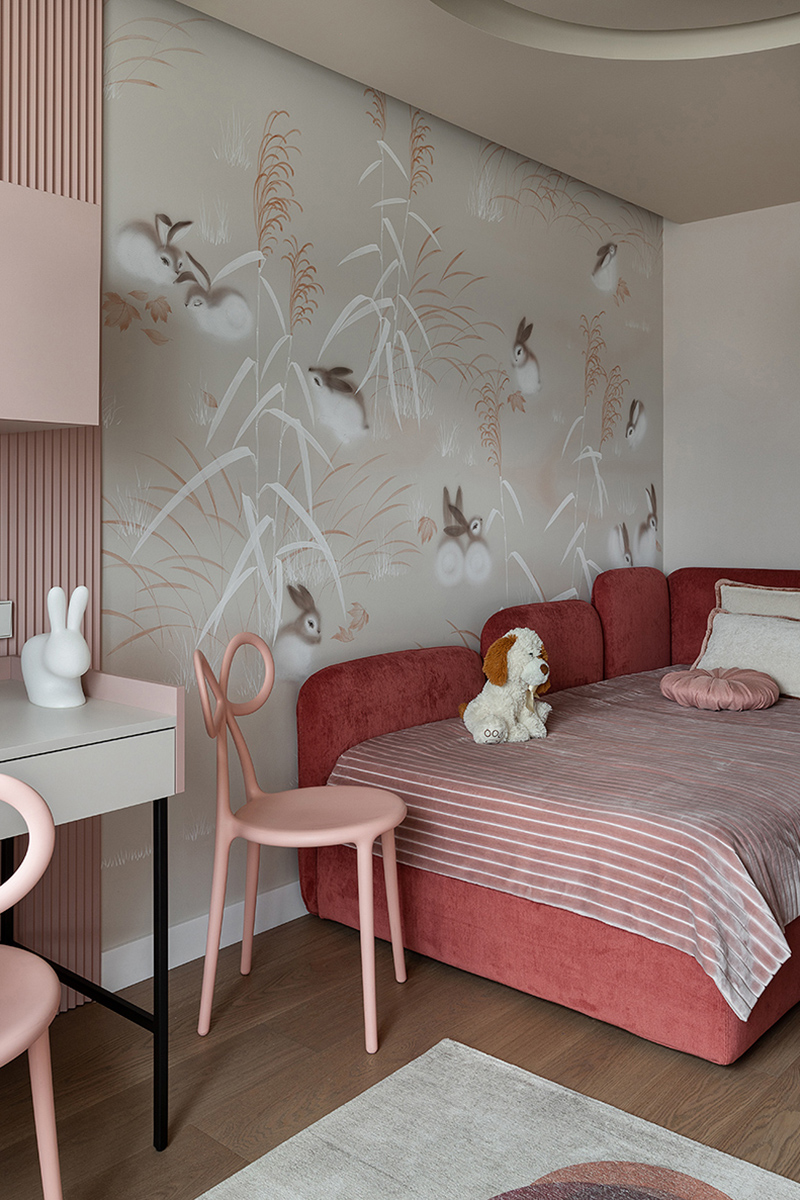 Несколько тонов шпона и разнообразие зелёных акцентов делают пространство многогранным: оно постоянно открывается с новой стороны, позволяя рассматривать детали и наслаждаться нюансами. Компактная кухня с островом продумана до мелочей и сочетает в себе функциональность и лёгкость. Гостиная наполнена светом и теплом дубового шпона, а вертикальные рейки и зеркальные вставки создают игру объёмов и ощущение воздуха. В спальне акцентом стала уникальная декоративная панель, созданная вручную, которая превращает небольшую комнату в камерное и атмосферное пространство. Особое внимание уделено детским: они выполнены в том же стиле, что и весь интерьер, но дополнены яркими акцентами и функциональными решениями для игр и учёбы.