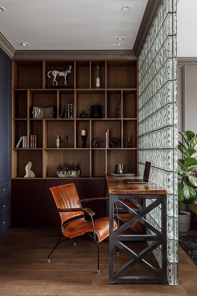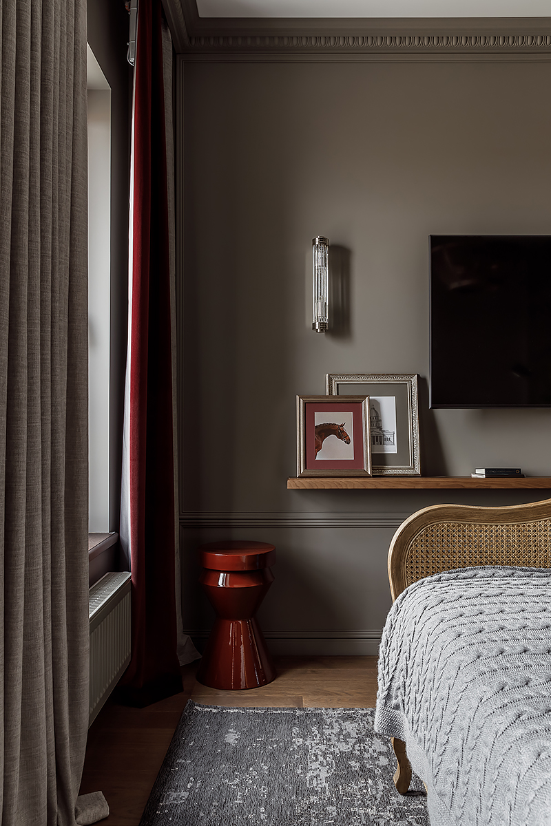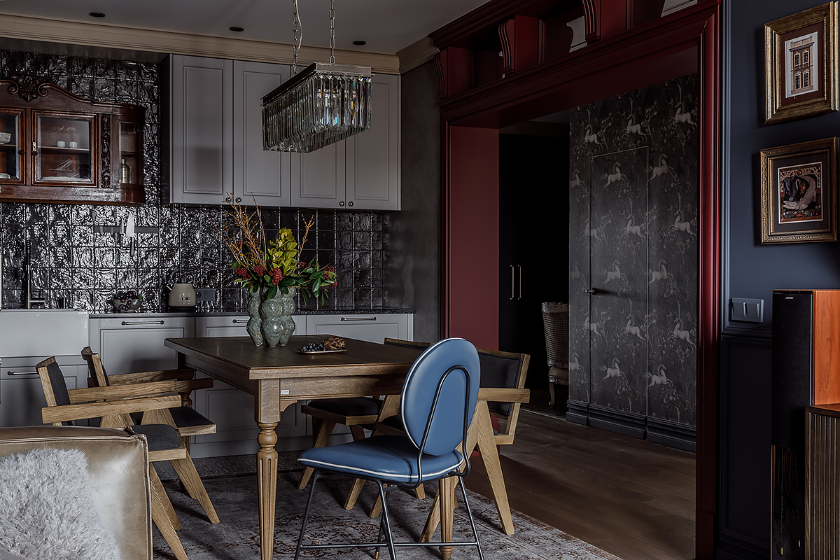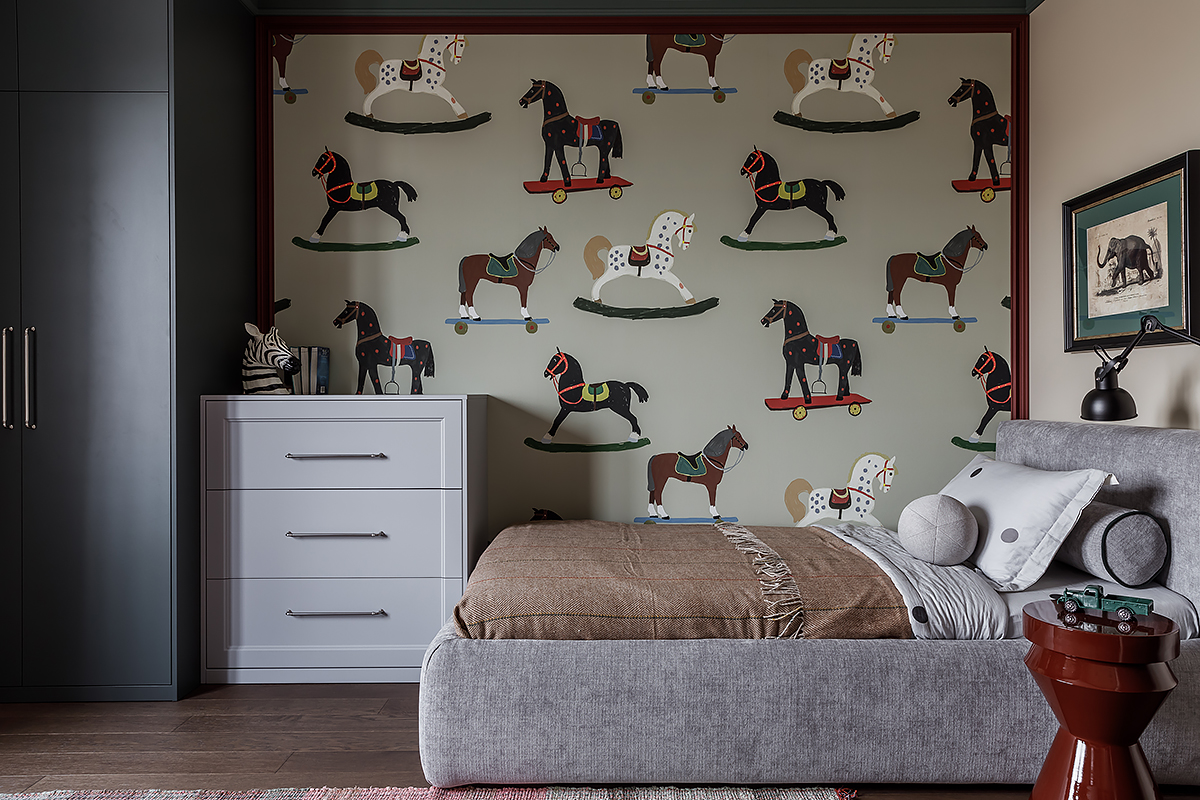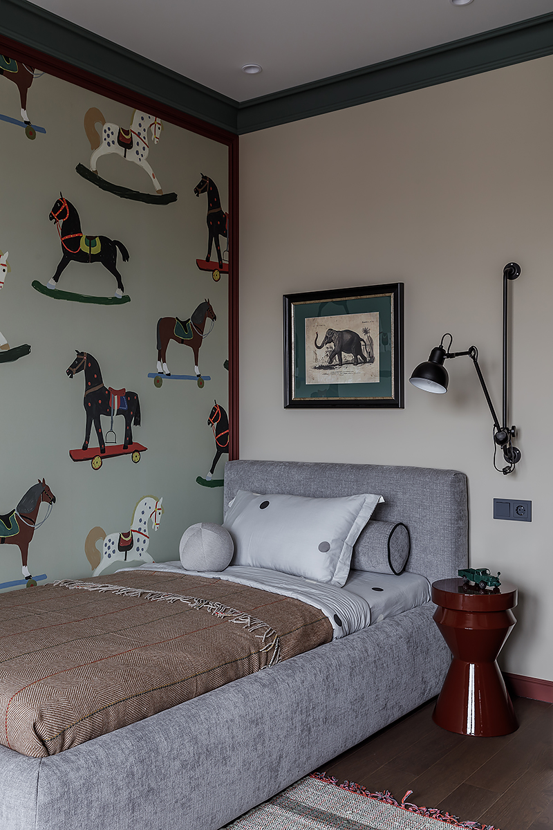 Разные элементы дизайна собираются в единый образ благодаря гармоничному сочетанию материалов и акцентов. Здесь нет строгих стилистических рамок: в отделке и мебели проявляется тяга к классике, в бетоне, металле и коже — уверенная брутальность натуральных фактур, а в образах коней, встречающихся в разных формах почти в каждой комнате, — лёгкая ирония и эмоциональность. Всё это создаёт атмосферу подлинности и уюта, где каждая деталь несёт свою историю, а не просто служит декорацией.