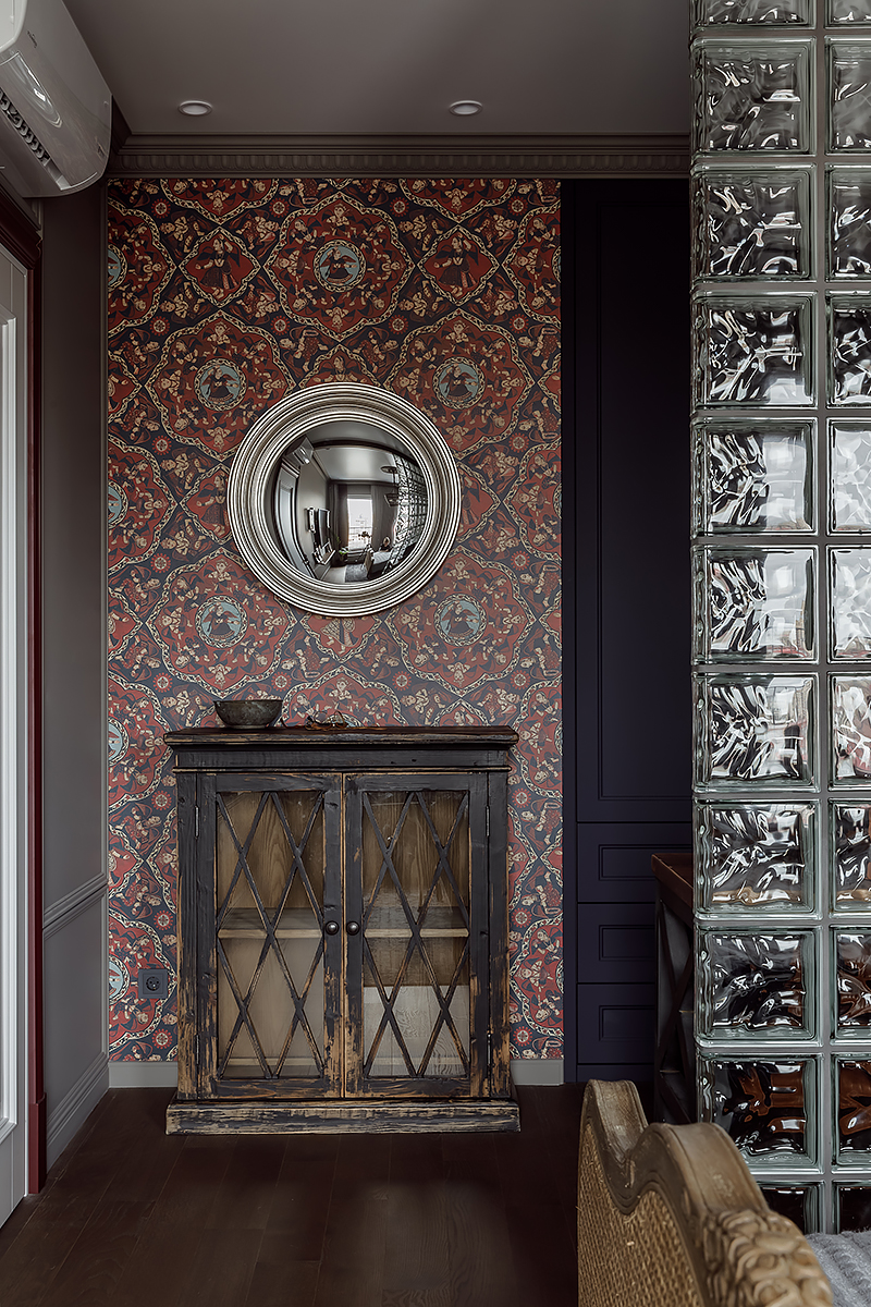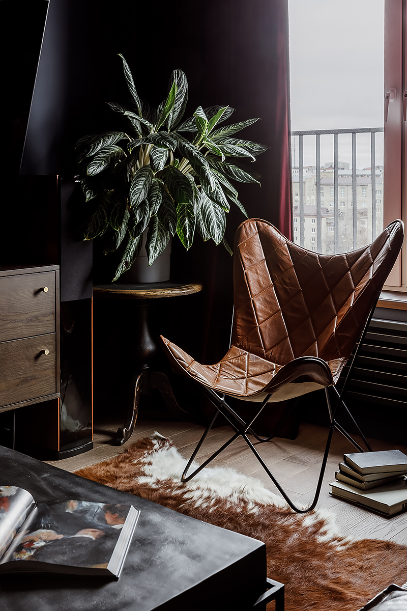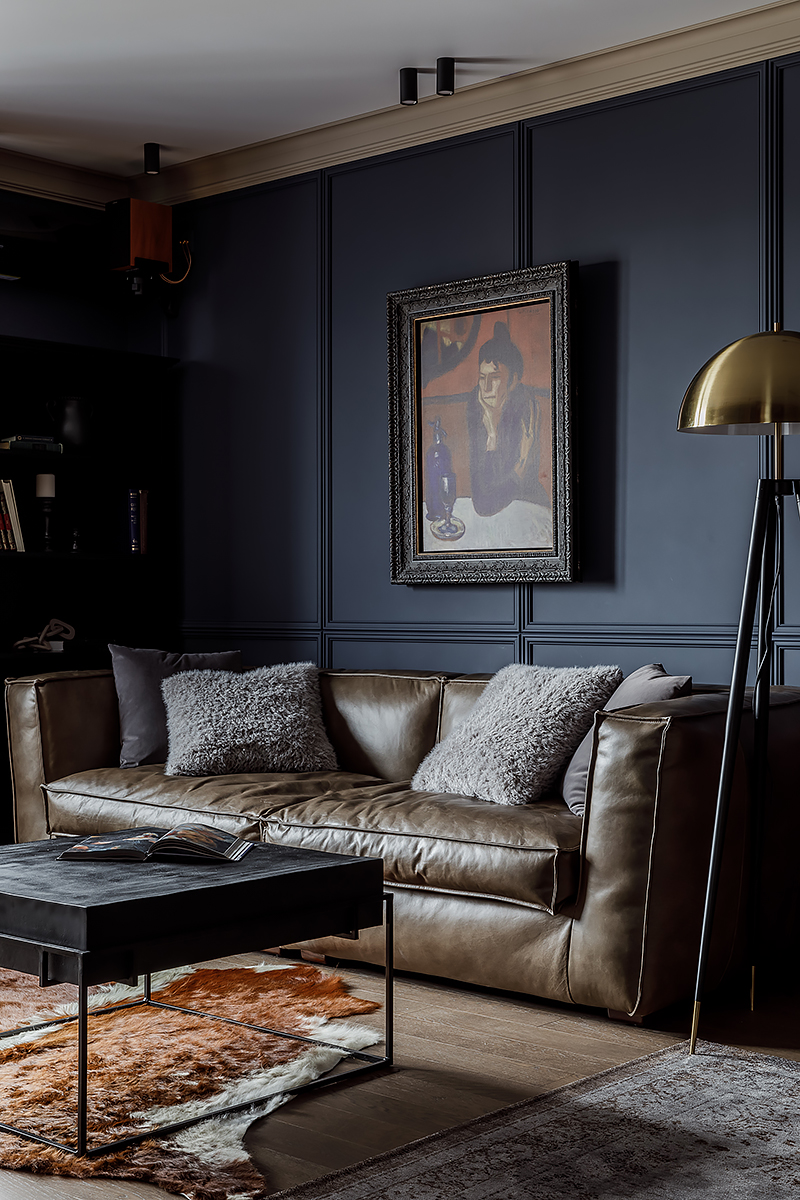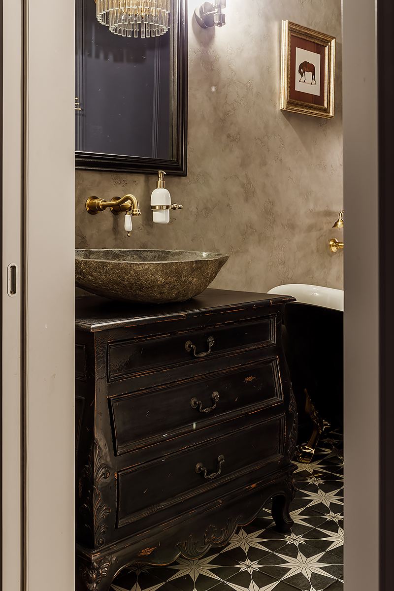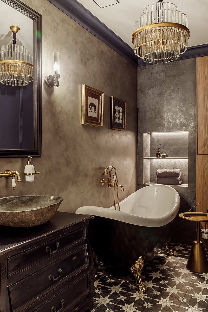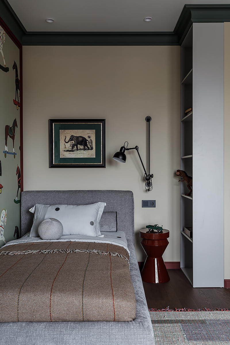 Разные элементы дизайна собираются в единый образ благодаря гармоничному сочетанию материалов и акцентов. Здесь нет строгих стилистических рамок: в отделке и мебели проявляется тяга к классике, в бетоне, металле и коже — уверенная брутальность натуральных фактур, а в образах коней, встречающихся в разных формах почти в каждой комнате, — лёгкая ирония и эмоциональность. Всё это создаёт атмосферу подлинности и уюта, где каждая деталь несёт свою историю, а не просто служит декорацией.