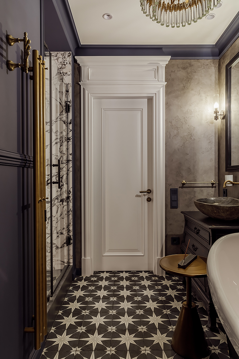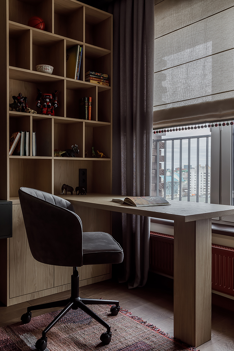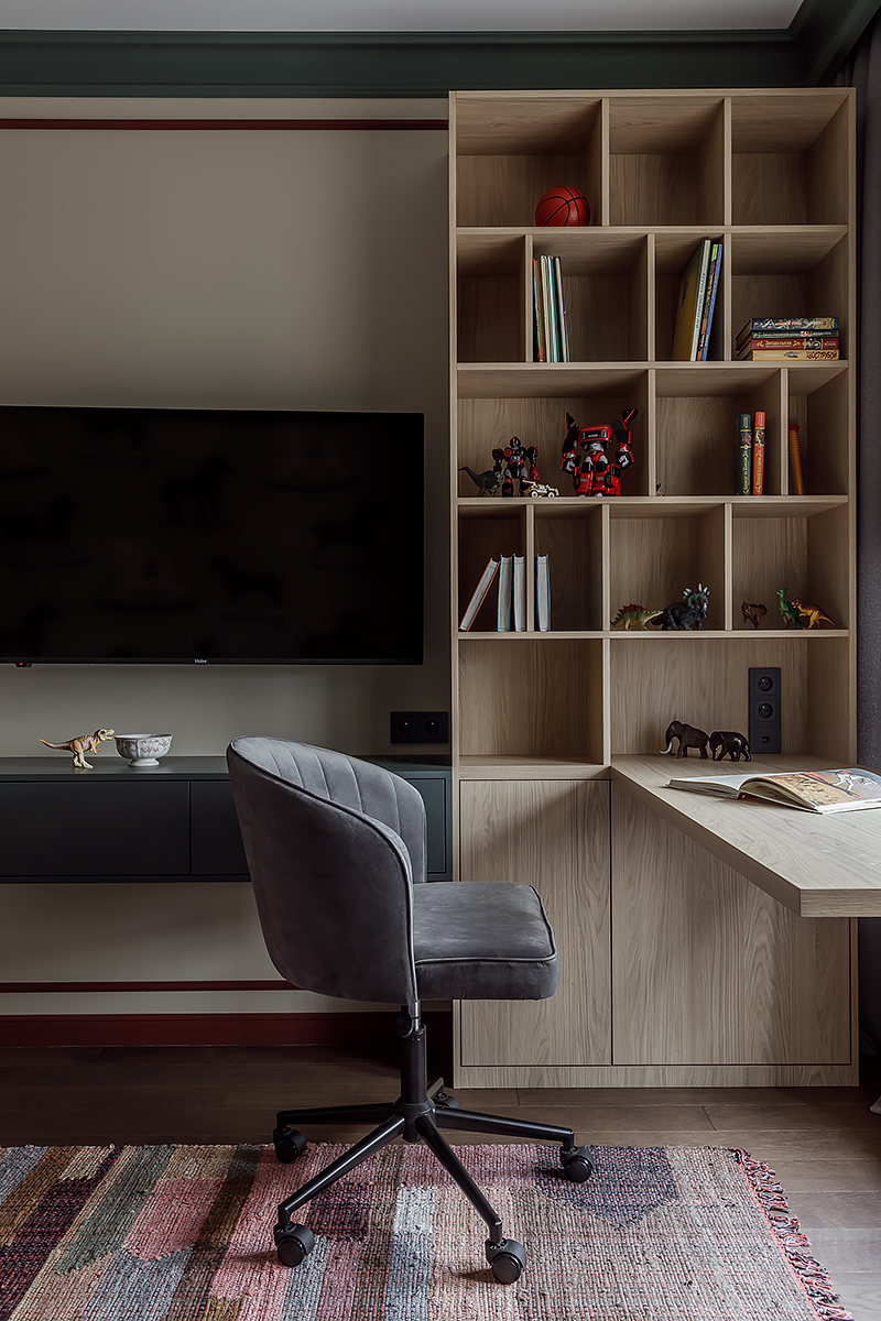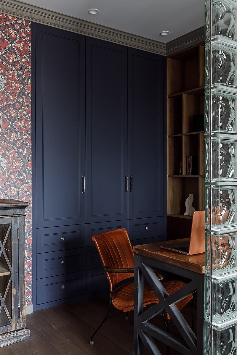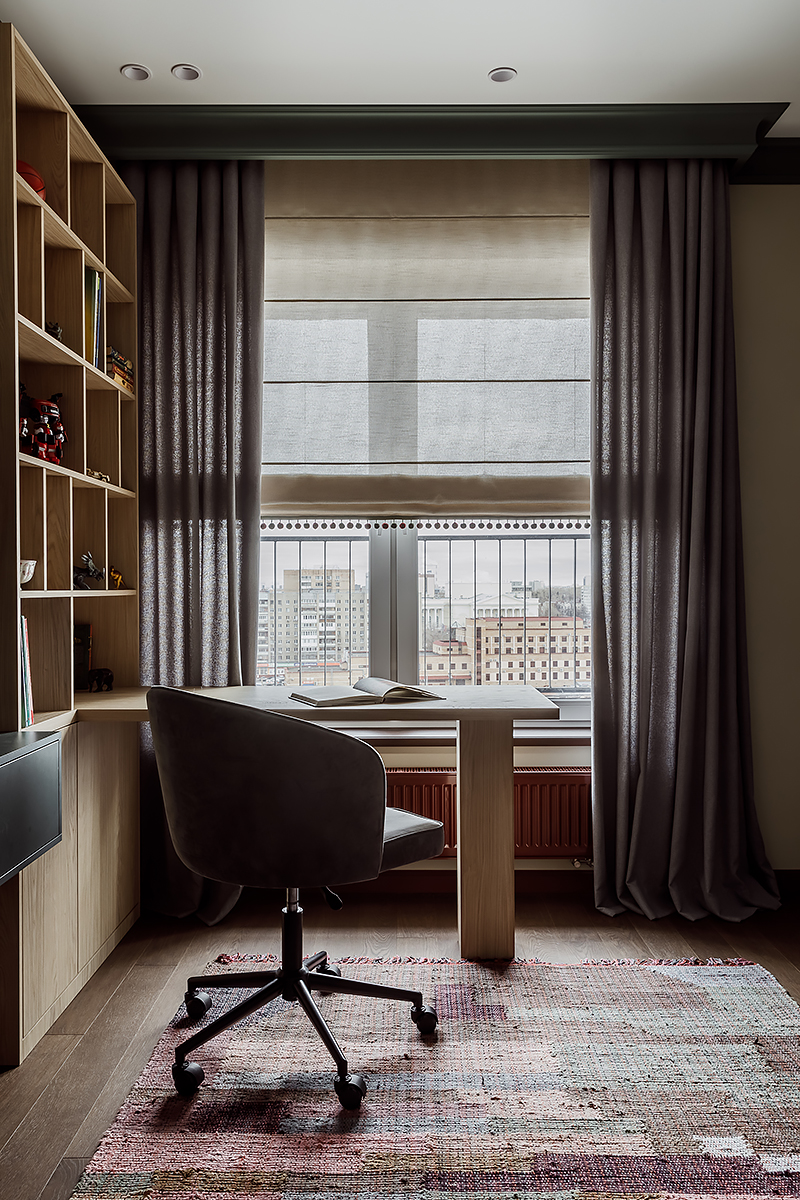 Разные элементы дизайна собираются в единый образ благодаря гармоничному сочетанию материалов и акцентов. Здесь нет строгих стилистических рамок: в отделке и мебели проявляется тяга к классике, в бетоне, металле и коже — уверенная брутальность натуральных фактур, а в образах коней, встречающихся в разных формах почти в каждой комнате, — лёгкая ирония и эмоциональность. Всё это создаёт атмосферу подлинности и уюта, где каждая деталь несёт свою историю, а не просто служит декорацией.