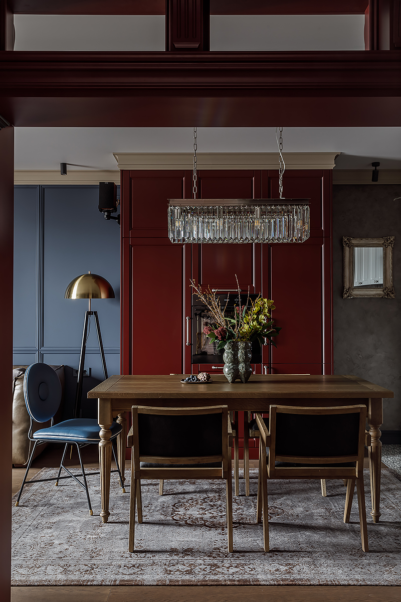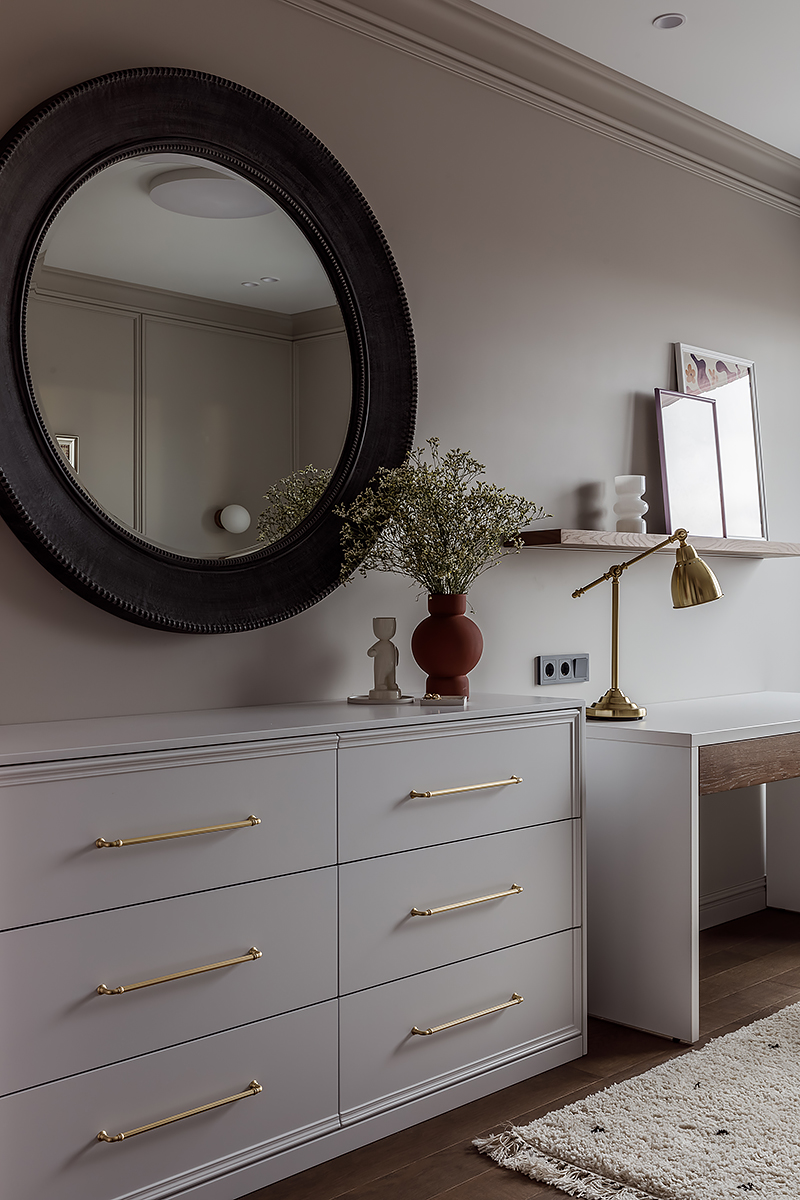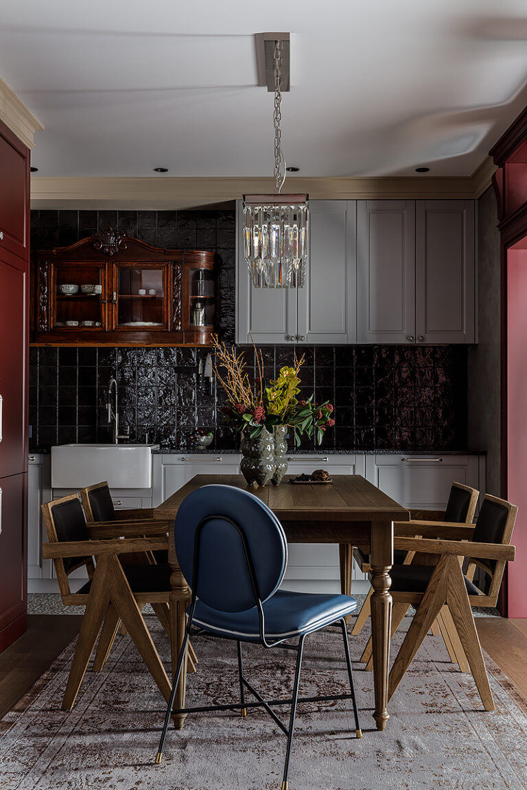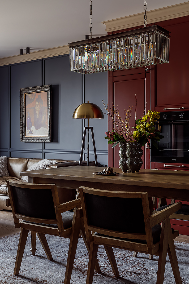 Интерьер этого проекта отражает характер его владельца — успешного предпринимателя и заботливого отца. Дом задумывался как место, в котором уже живут: без глянца и искусственной новизны, с множеством предметов с историей. Кушетка из прошлого дома задала настроение всему интерьеру и вдохновила на выбор панно с белыми конями, а антикварный буфет из Германии органично вписался в кухню.