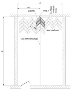 - Закрепите на основании шаблон под углом 45 градусов к осевой линии и упор обеспечивающий компенсационный зазор до стены 8…мм.