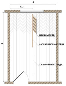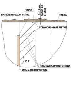 - Установите по базовой отметке направляющую рейку так, чтобы производить укладку справа от неё. Рейка должна быть зафиксирована на основании, чтобы исключался её сдвиг при установке планок. рис. 1.
