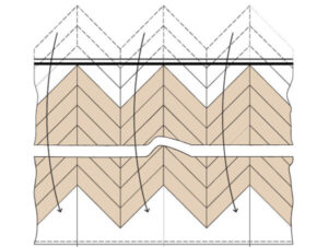Монтаж паркетной доски Coswick с фигурной геометрией планок, позволяющий создать выразительный диагональный рисунок пола с характерным «V»-образным стыком.